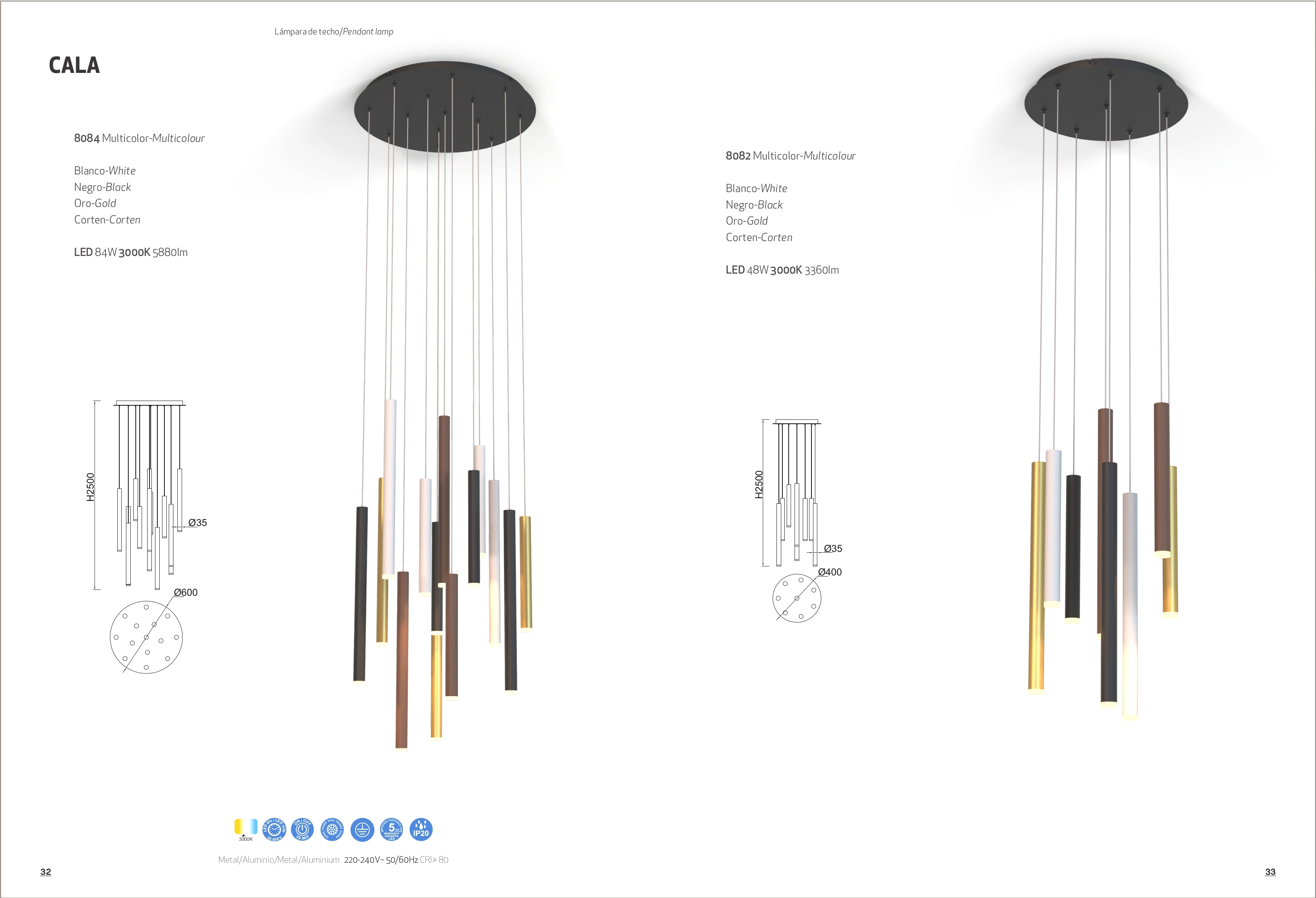 Осветителното тяло 8084 White+Black+Gold+Corten 84W 3000K 5880lm CALA ще осигури комфорт и естетика във всяко помещение, в което се постави. Цялостната визия и дизайн на лампата и вложените в изработката й материали, като алуминий и метал в цветове: бяло, черно, златно и ръжда, ще допринесат за един неповторим стил. Благодарение на дългогодишния опит, качествените материали и строгия контрол на качеството на изработка на производителя Mantra (Испания), 8084 White+Black+Gold+Corten 84W 3000K 5880lm CALA е на високо европейско ниво.
