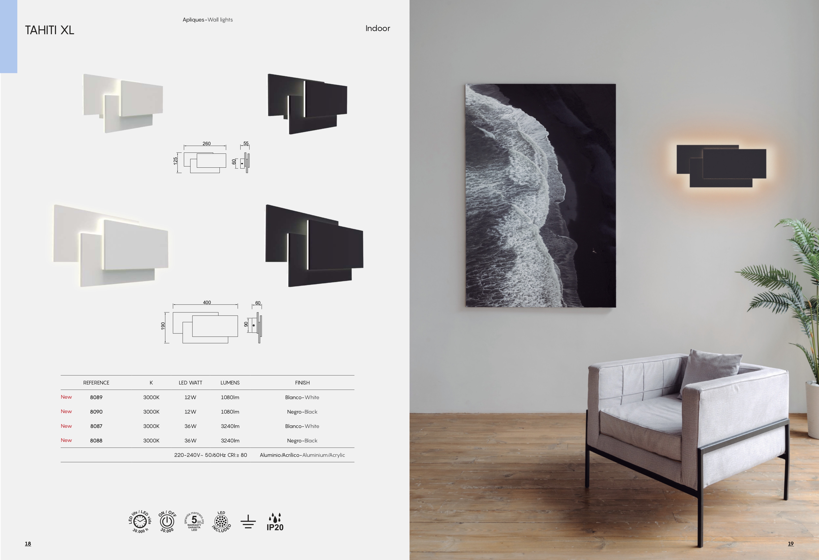 Лед аплик 8088 Black 36W 3000K 3240lm TAHITI XL ще осигури комфорт и естетика във всяко помещение, в което се постави. Цялостната визия и дизайн на led лампата и вложените в изработката й материали, като алуминий в черен цвят, полимер в бяло, ще допринесат за един неповторим стил. Благодарение на дългогодишния опит в производството на лед осветление, качествените материали и строгия контрол на качеството на изработка на производителя Mantra (Испания), 8088 Black 36W 3000K 3240lm TAHITI XL е на високо европейско ниво.