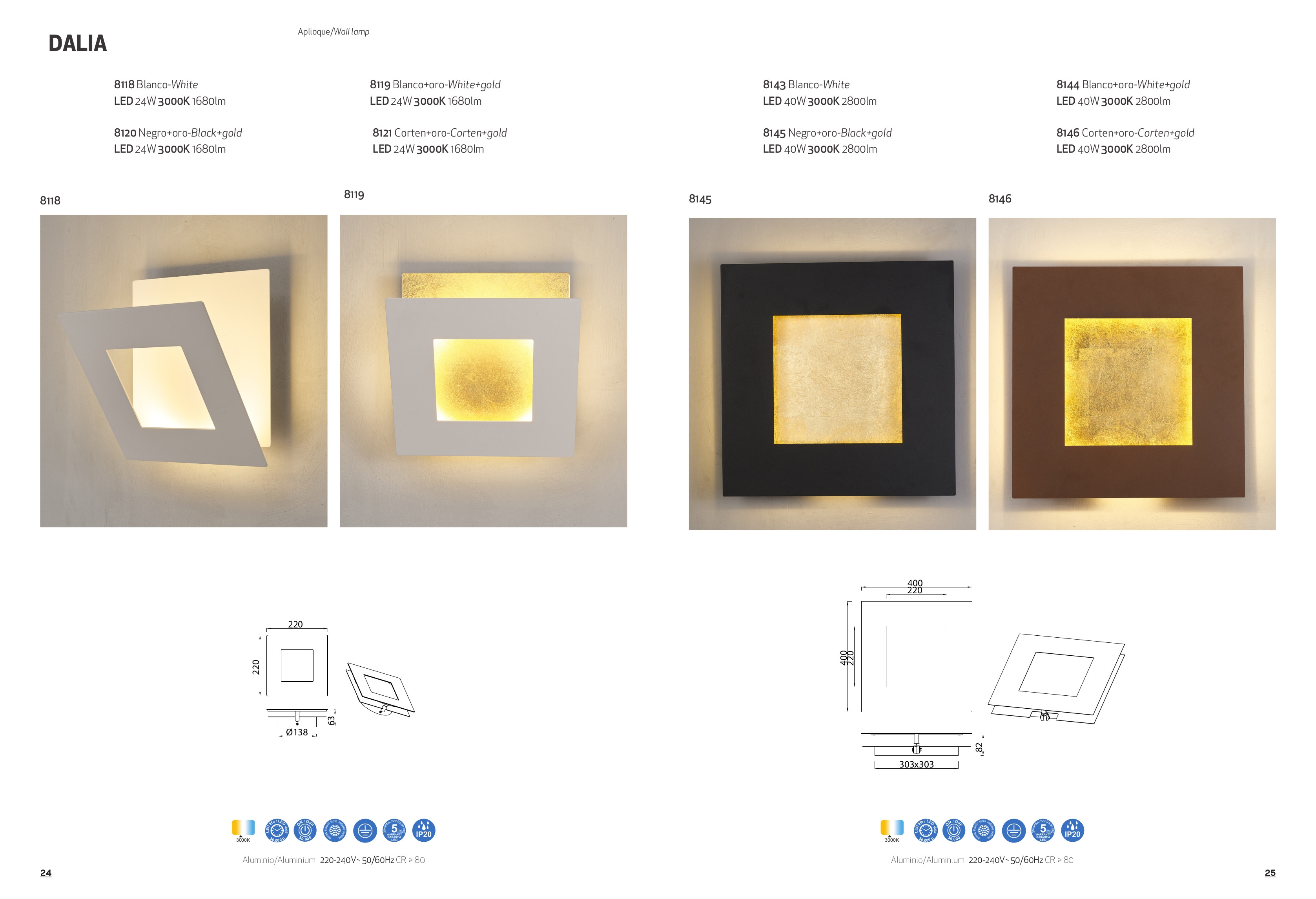 Лед аплик 8121 Corten +Gold 24W 3000K 1680lm DALIA ще осигури комфорт и естетика във всяко помещение, в което се постави. Цялостната визия и дизайн на led лампата и вложените в изработката й материали, като алуминий в цвят ръжда + златен цвят, ще допринесат за един неповторим стил. Благодарение на дългогодишния опит в производството на лед осветление, качествените материали и строгия контрол на качеството на изработка на производителя Mantra (Испания), 8121 Corten +Gold 24W 3000K 1680lm DALIA е на високо европейско ниво.