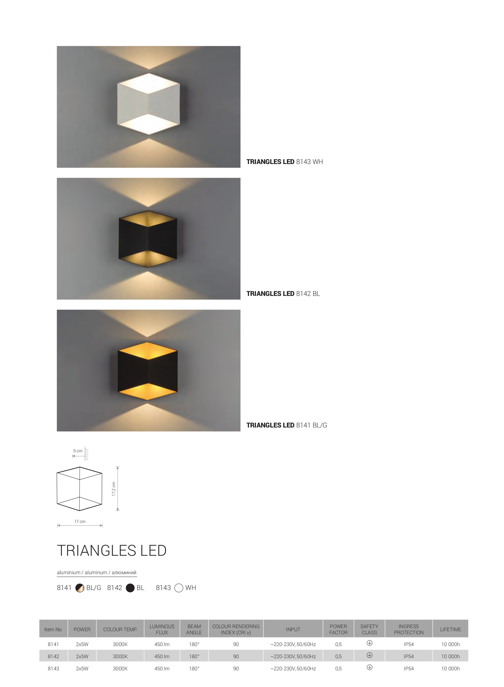 Осветителното тяло 8143 TRIANGLESS White представлява аплик, външна лампа в съвременен стил. 8143 TRIANGLESS White е от категорията осветителни тела и е подходящо за осветяване на различни помещения и пространства като: спалня, коридор, антре, стълбище, офис, външно осветление, фасадно осветление.