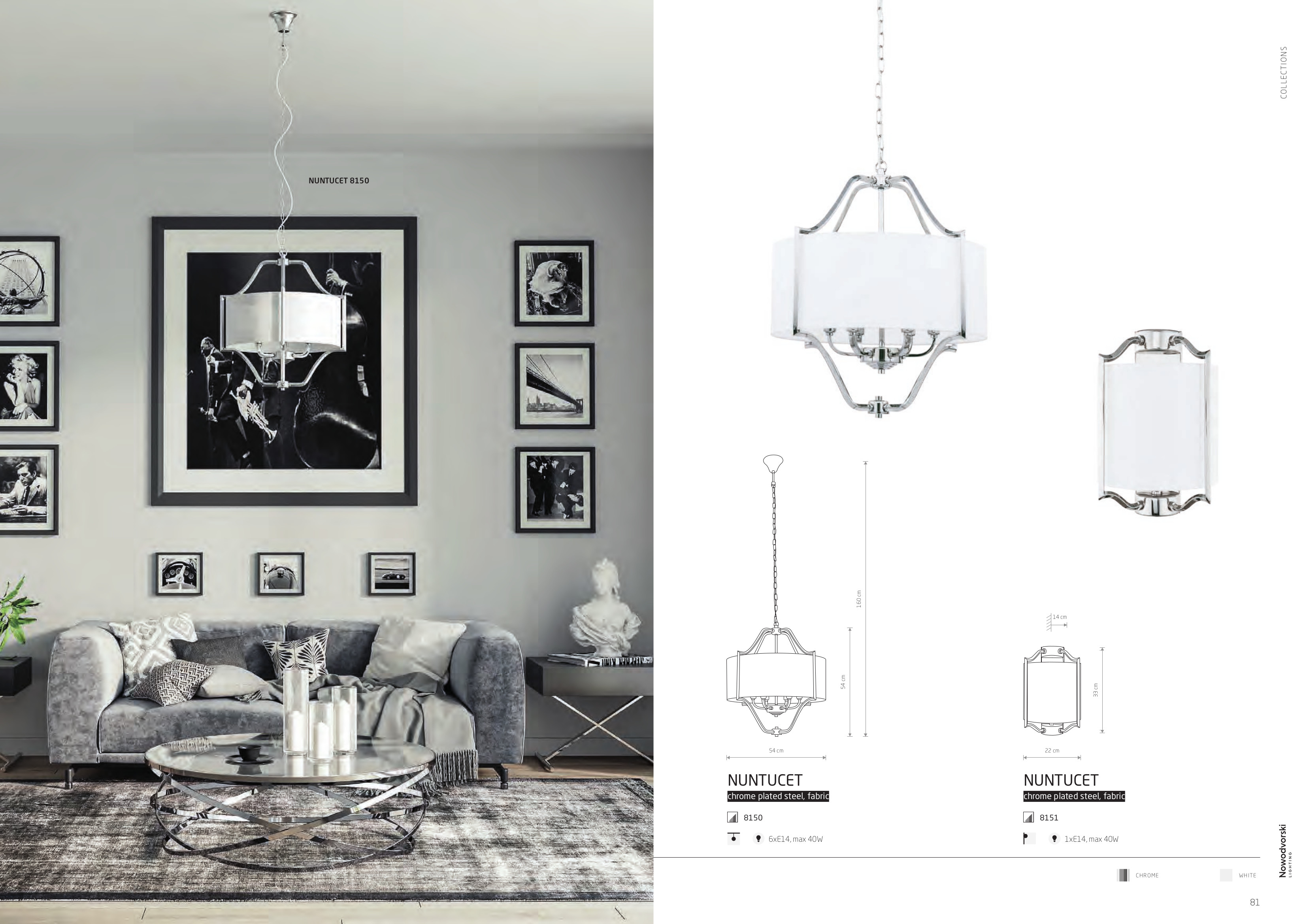 За стила и естетиката на обстановката допринасят, както цялостната визия и дизайн на осветителното тяло, така и вложените в изработката качествени материали, като: хромирана стомана, абажур от текстил в бял цвят.