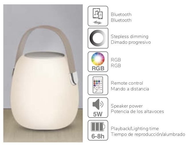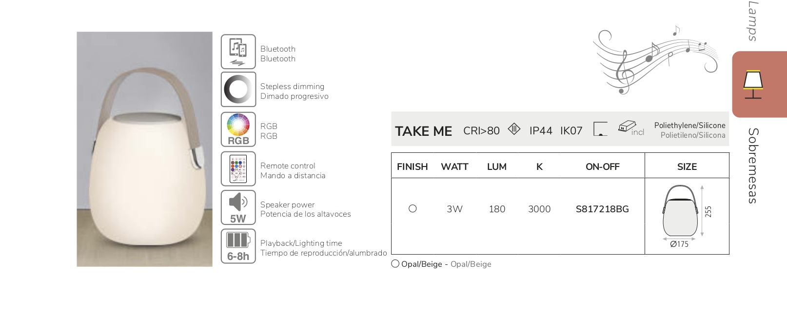 Осветителното тяло S817218BG (8172 3W/RGB Opal/Beige IP44) ще осигури комфорт и естетика във всяко помещение, в което се постави. Цялостната визия и дизайн на лампата и вложените в изработката й материали, като силикон в опалово бяло, полиетилен в кафяво, bluetooth, тонколонка, RGB, време на светене след зареждане 6-8h, ще допринесат за един неповторим стил. Благодарение на дългогодишния опит, качествените материали и строгия контрол на качеството на изработка на производителя ACB (Испания), S817218BG (8172 3W/RGB Opal/Beige IP44) е на високо европейско ниво.