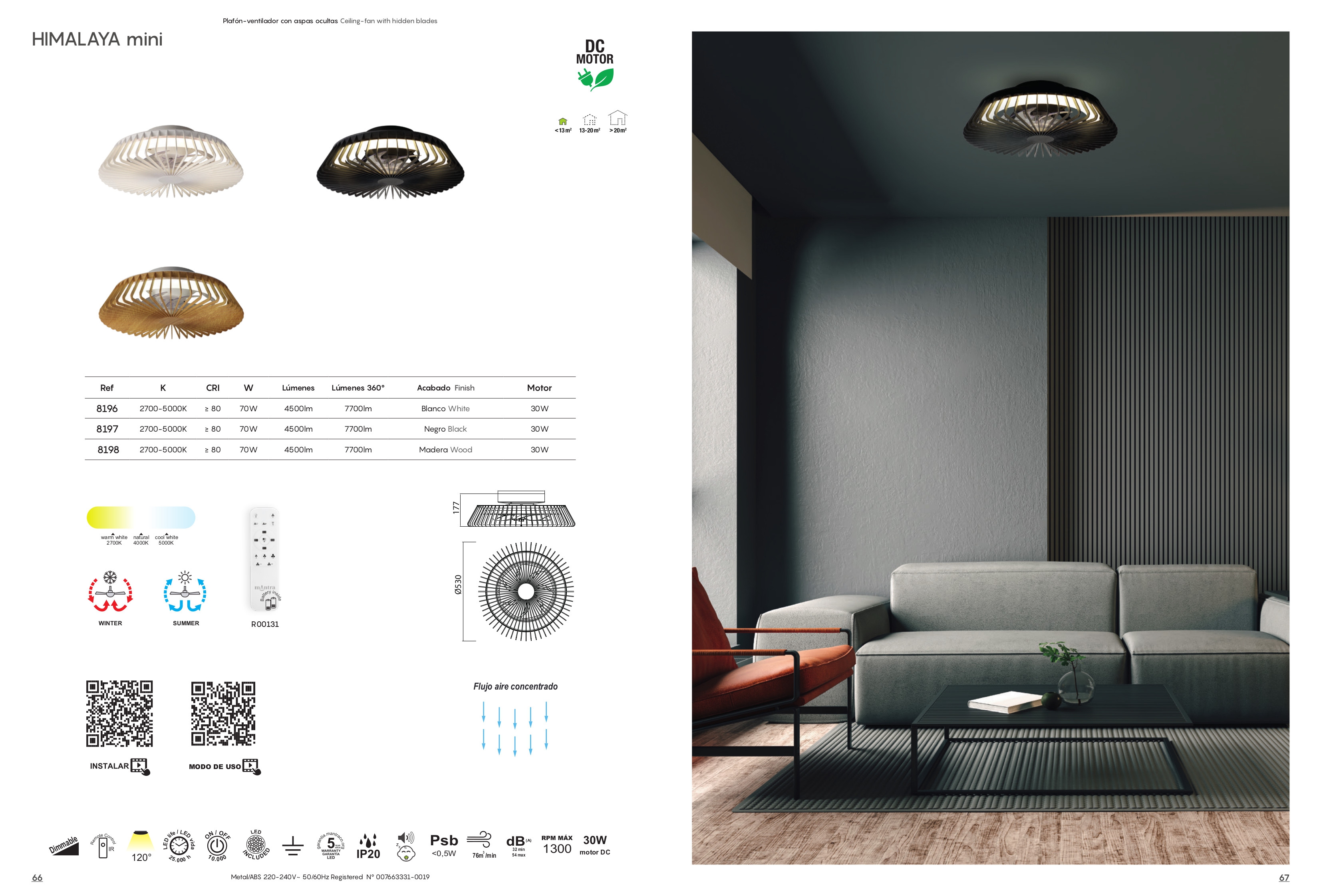 Лед плафон 8197 Black 70W 2700K-5000K 4500lm HIMALAYA MINI ще осигури комфорт и естетика във всяко помещение, в което се постави. Цялостната визия и дизайн на led лампата и вложените в изработката й материали, като метал в бял цвят, полимер (ABS) в цвят естествено дърво, интегриран вентилатор с DC мотор 30W, регулиране на цветната температура и вентилатора с дистанционно, ще допринесат за един неповторим стил. Благодарение на дългогодишния опит в производството на лед осветление, качествените материали и строгия контрол на качеството на изработка на производителя Mantra (Испания), 8197 Black 70W 2700K-5000K 4500lm HIMALAYA MINI е на високо европейско ниво.