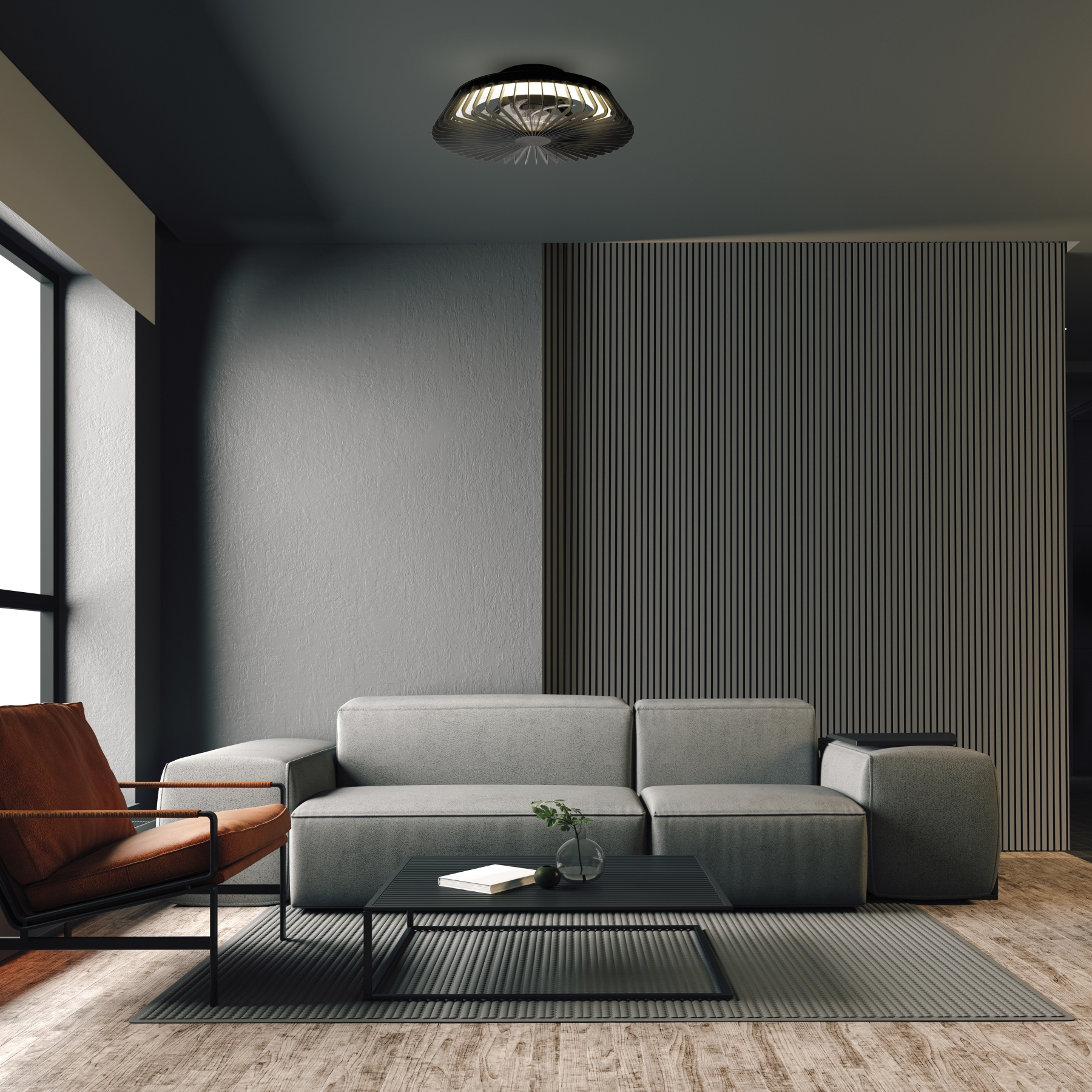 метал в черен цвят, полимер (ABS) в бяло, интегриран вентилатор с DC мотор 30W, регулиране на цветната температура и вентилатора с дистанционно