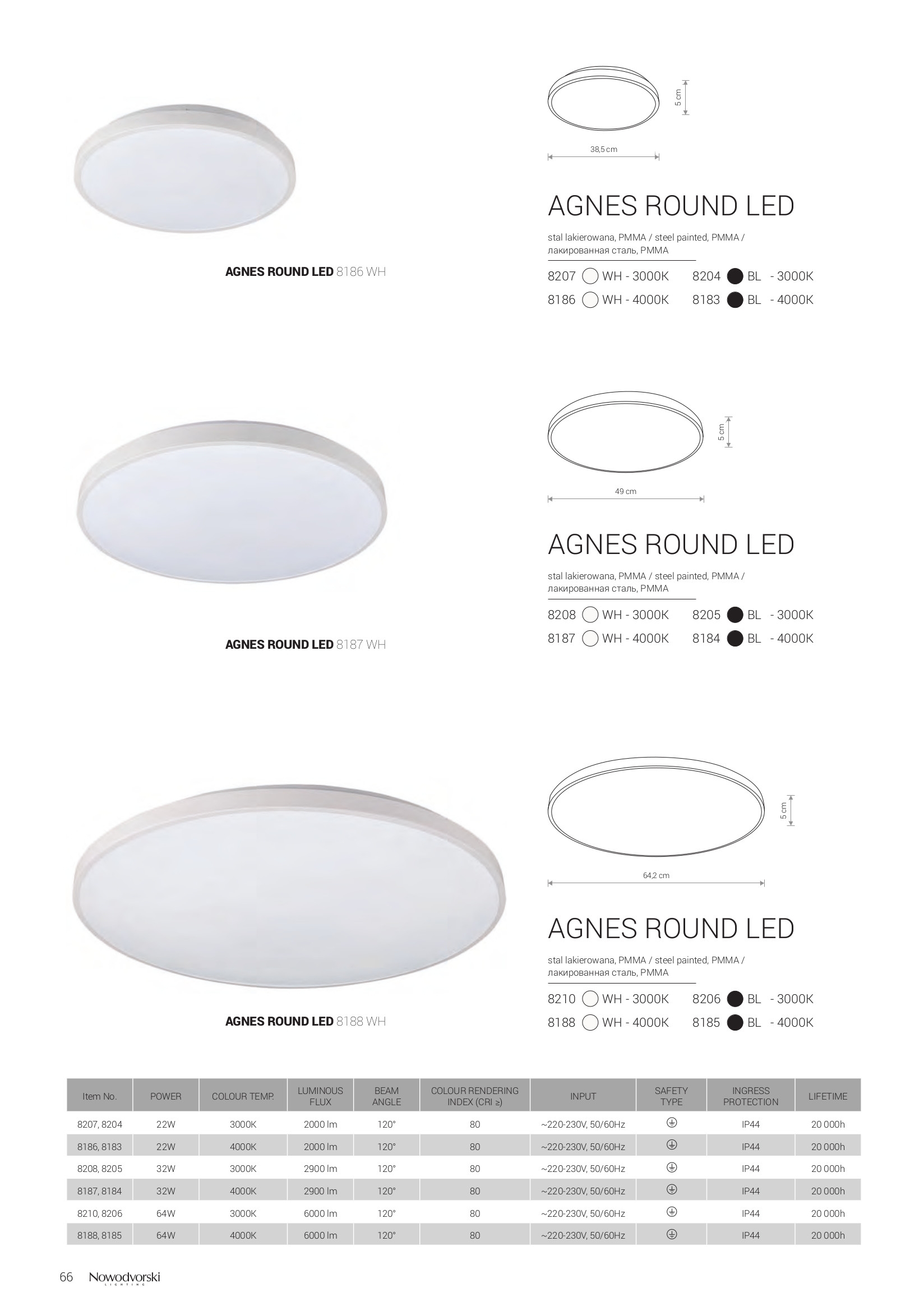 Осветителното тяло 8207 AGNES ROUND LED WHITE 22W/3000K IP44 ще осигури комфорт и естетика във всяко помещение, в което се постави. Цялостната визия и дизайн на лампата и вложените в изработката й материали, като стомана в бял цвят, дифузер от бял полимер, ще допринесат за един неповторим стил. Благодарение на дългогодишния опит, качествените материали и строгия контрол на качеството на изработка на производителя Nowodvorski (Полша), 8207 AGNES ROUND LED WHITE 22W/3000K IP44 е на високо европейско ниво.