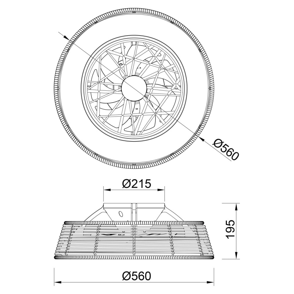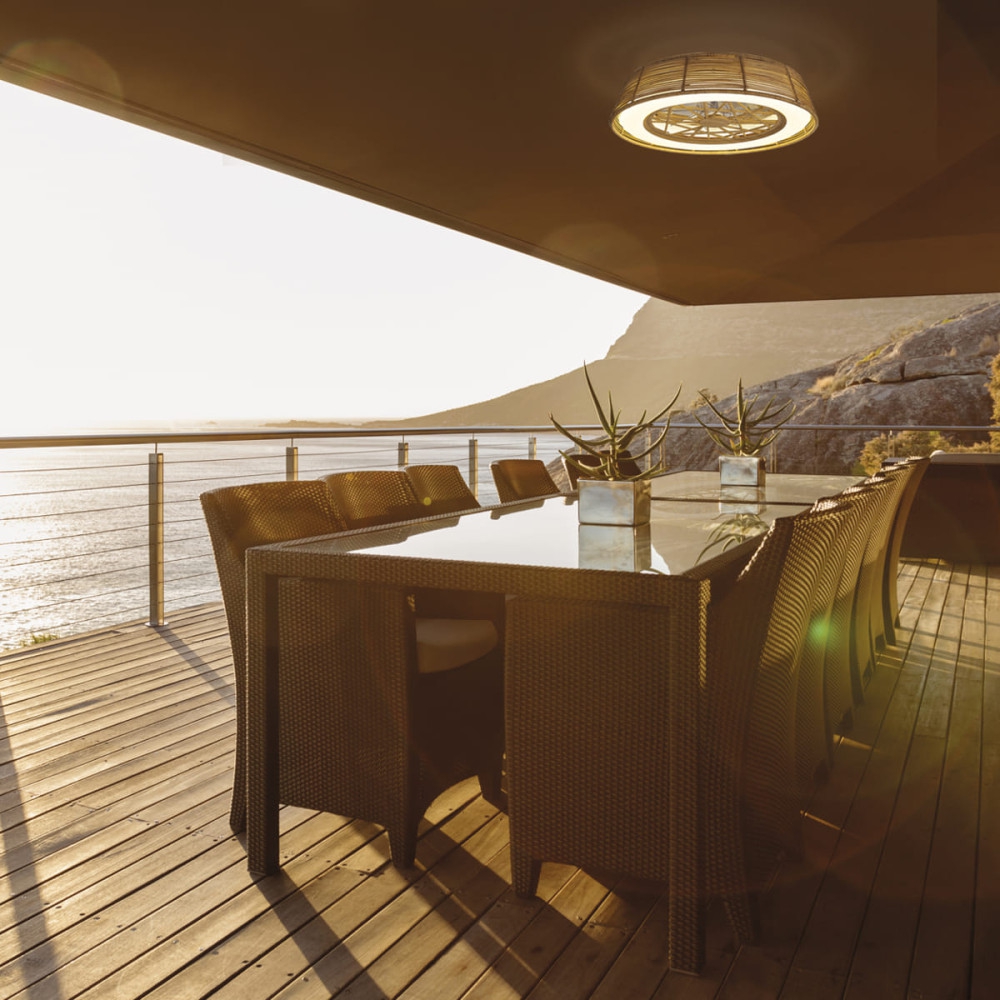 полимер в бяло, естествен ратан, дифузер от полимер в млечно бяло, интегриран вентилатор с DC мотор 25W със скрити перки, дистанционно, регулиращо скороста на въртене, посоката на въздушната струя, цветната температура на светлината и интензитета и, нощен