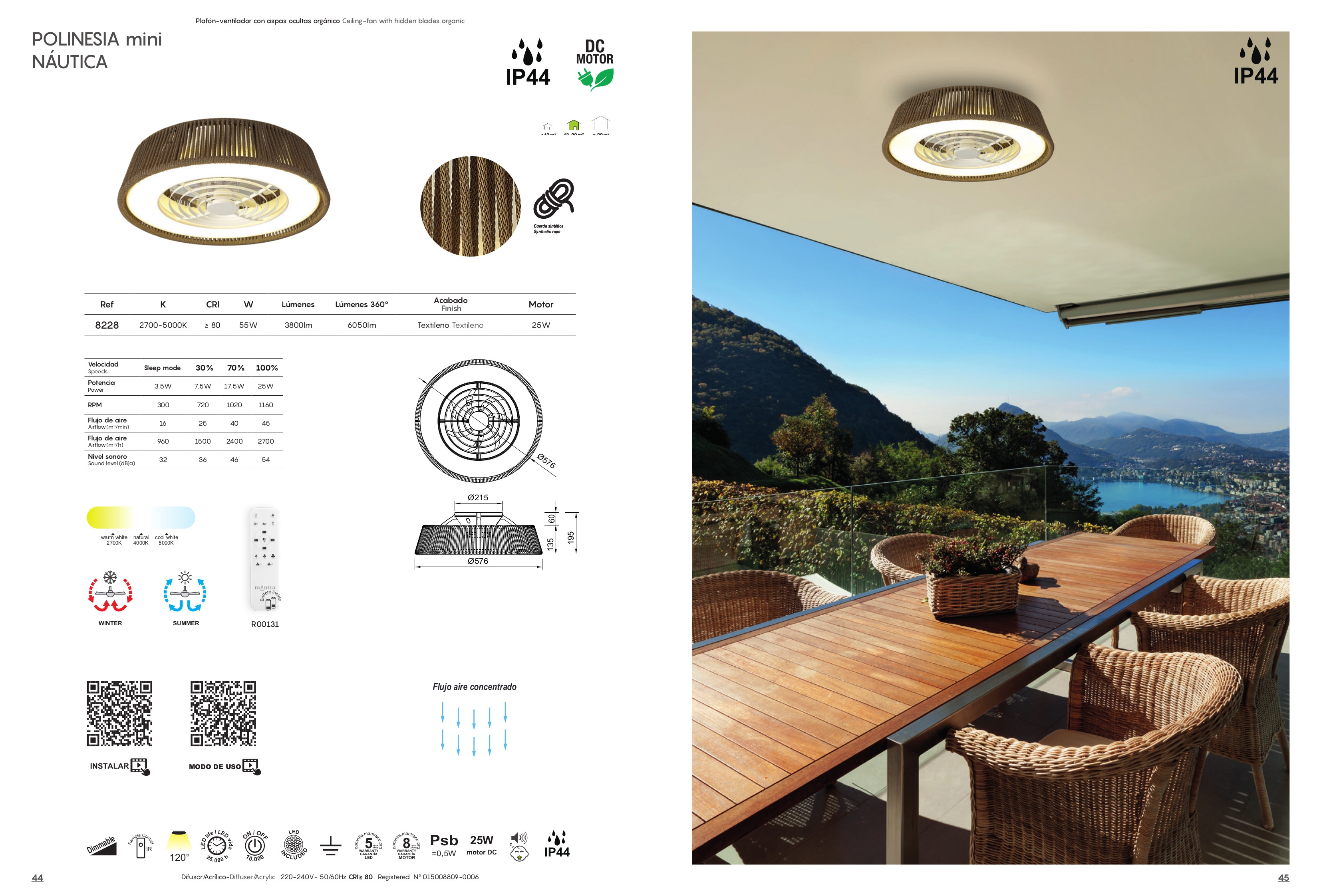 Осветителното тяло 8228 Textileno LED 55W/2700K-5000K Ventilador 25W ще осигури комфорт и естетика във всяко помещение, в което се постави. Цялостната визия и дизайн на лампата и вложените в изработката й материали, като полимер в бяло, синтетично въже в естествен цвят, дифузер от акрил в бяло, интегриран вентилатор с DC мотор 35 W, дистанционно за регулиране на интензитета на светлината, цветната температура, силата и посоката на въздушната струя, нощен режим и таймер, ще допринесат за един неповторим стил. Благодарение на дългогодишния опит, качествените материали и строгия контрол на качеството на изработка на производителя Mantra (Испания), 8228 Textileno LED 55W/2700K-5000K Ventilador 25W е на високо европейско ниво.