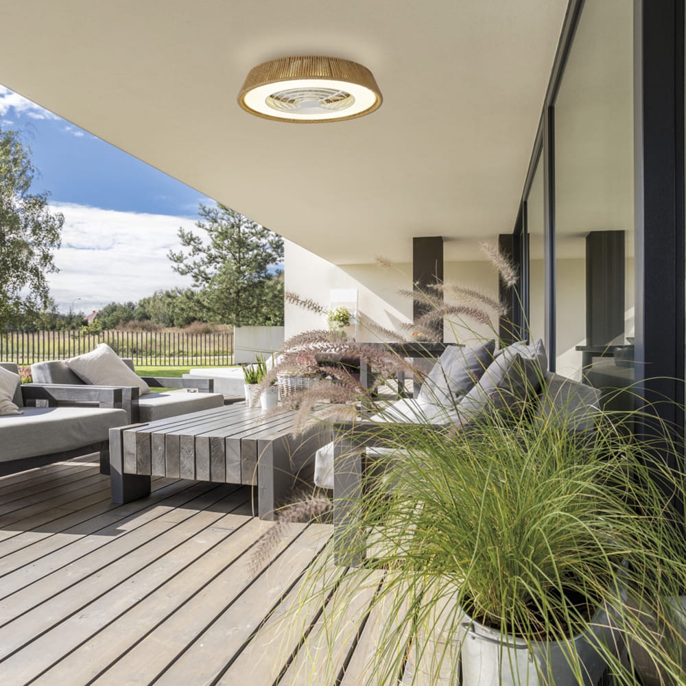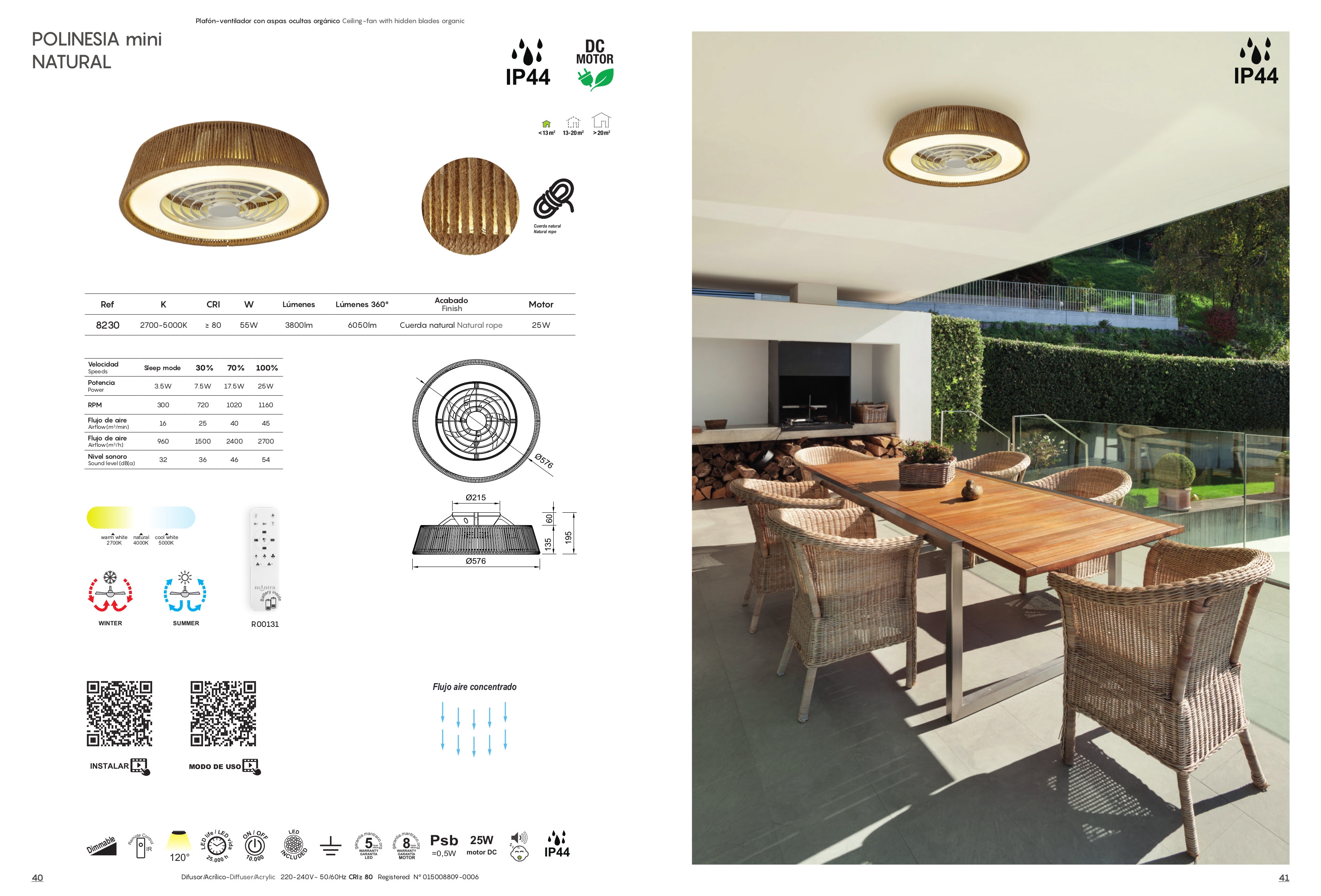 Осветителното тяло 8230 Cuerda Nat LED 55W/2700K-5000K Ventilador 25W представлява плафон, външна лампа в съвременен стил. 8230 Cuerda Nat LED 55W/2700K-5000K Ventilador 25W е от категорията осветителни тела и е подходящо за осветяване на различни помещения и пространства като: всекидневна / хол, спалня, кухня, трапезария, офис, външно осветление, фасадно осветление.