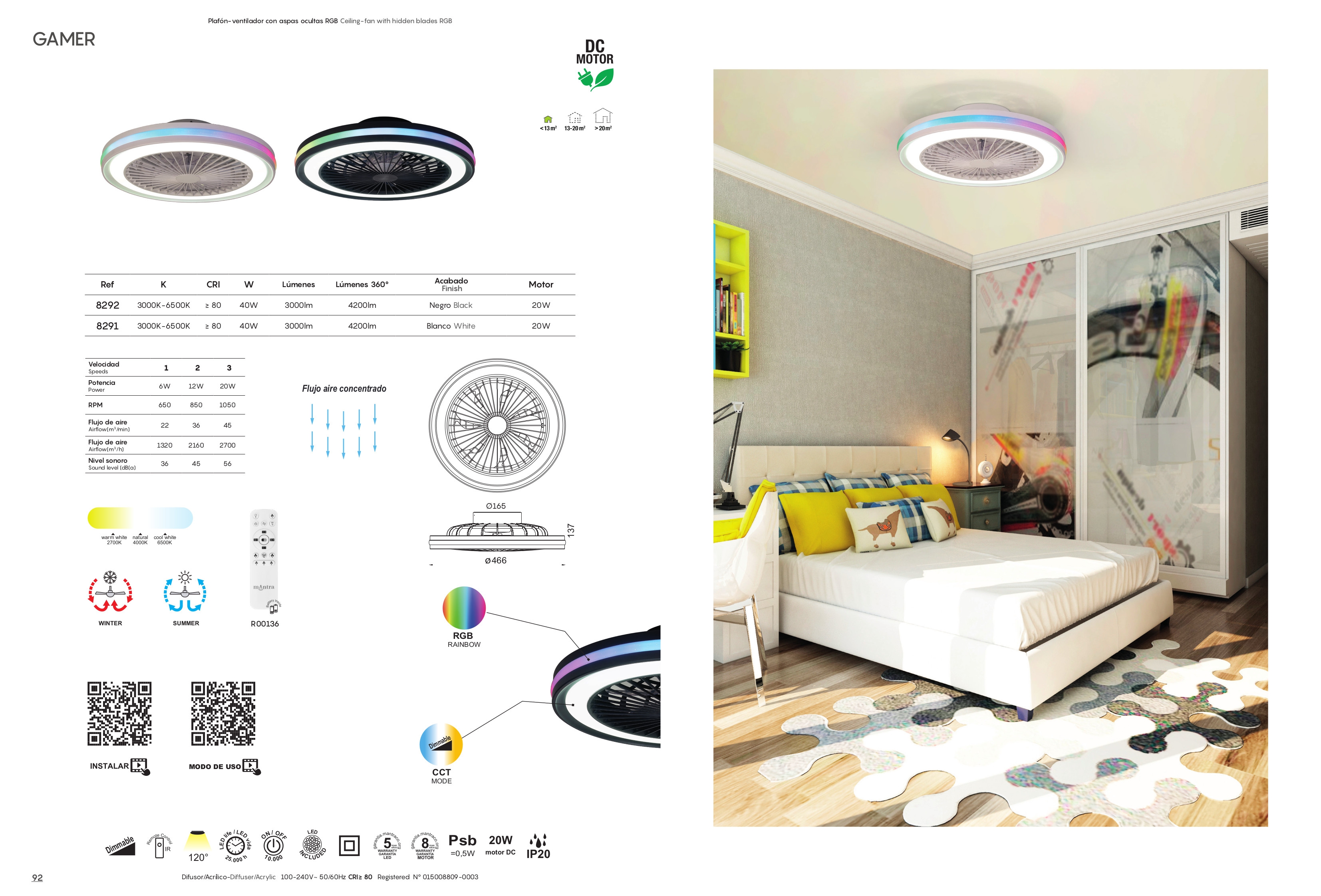 Лед плафон 8291 White 40W 3000K-6500K 3000lm GAMER ще осигури комфорт и естетика във всяко помещение, в което се постави. Цялостната визия и дизайн на led лампата и вложените в изработката й материали, като полимер в бял цвят, дифузер от акрил в бяло, интегриран вентилатор, регулиране на цветната температура, цвета на светлината (full RGB) и мощността на вентилатора с дистанционно управление включено в комплекта, ще допринесат за един неповторим стил. Благодарение на дългогодишния опит в производството на лед осветление, качествените материали и строгия контрол на качеството на изработка на производителя Mantra (Испания), 8291 White 40W 3000K-6500K 3000lm GAMER е на високо европейско ниво.