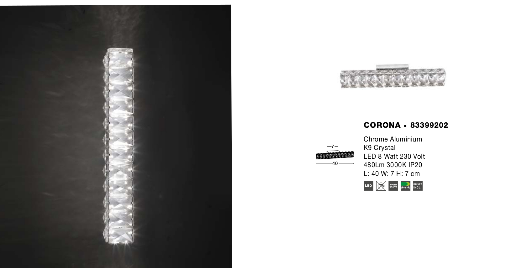Осветителното тяло 83399202 ще осигури комфорт и естетика във всяко помещение, в което се постави. Цялостната визия и дизайн на лампата и вложените в изработката й материали, като хромиран алуминий, К9 кристали, ще допринесат за един неповторим стил. Благодарение на дългогодишния опит, качествените материали и строгия контрол на качеството на изработка на производителя Nova-Luce (Гърция), 83399202 е на високо европейско ниво.