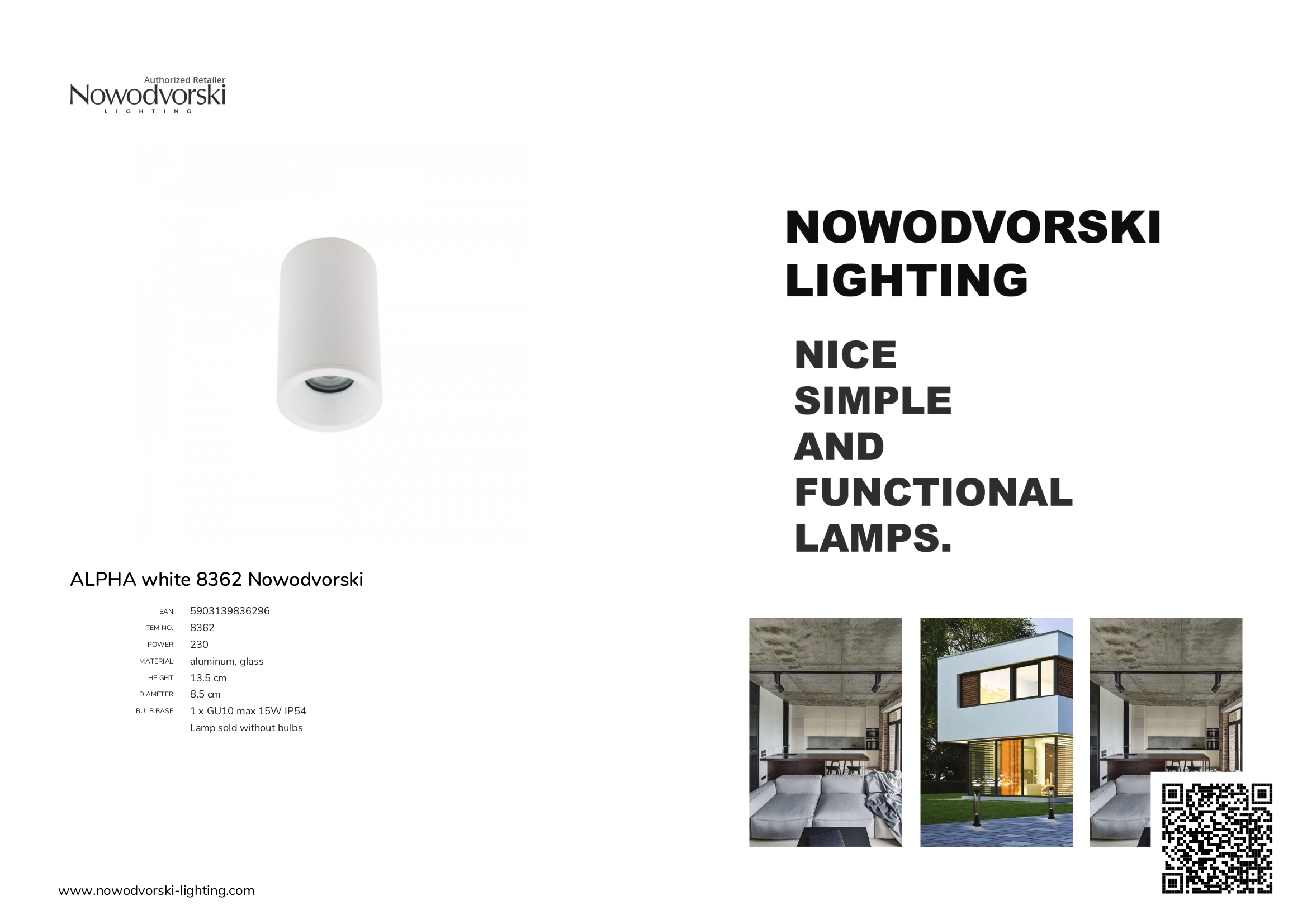 За стила, хармонията и естетиката на обстановката допринасят, както цялостната визия и дизайн на осветителното тяло, така и вложените в изработката качествени материали, като: сплав на цинк и алуминий в бял цвят, стъкло.