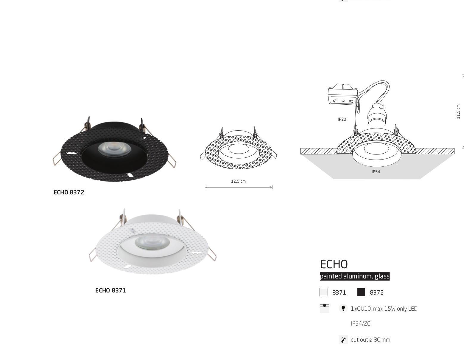 Осветителното тяло 8372 ECHO BLACK ще осигури комфорт и естетика във всяко помещение, в което се постави. Цялостната визия и дизайн на лампата и вложените в изработката й материали, като алуминий в черен цвят, стъкло, след вграждане и полагане на мазилка, продукта постига степен на защита IP54, ще допринесат за един неповторим стил. Благодарение на дългогодишния опит, качествените материали и строгия контрол на качеството на изработка на производителя Nowodvorski (Полша), 8372 ECHO BLACK е на високо европейско ниво.