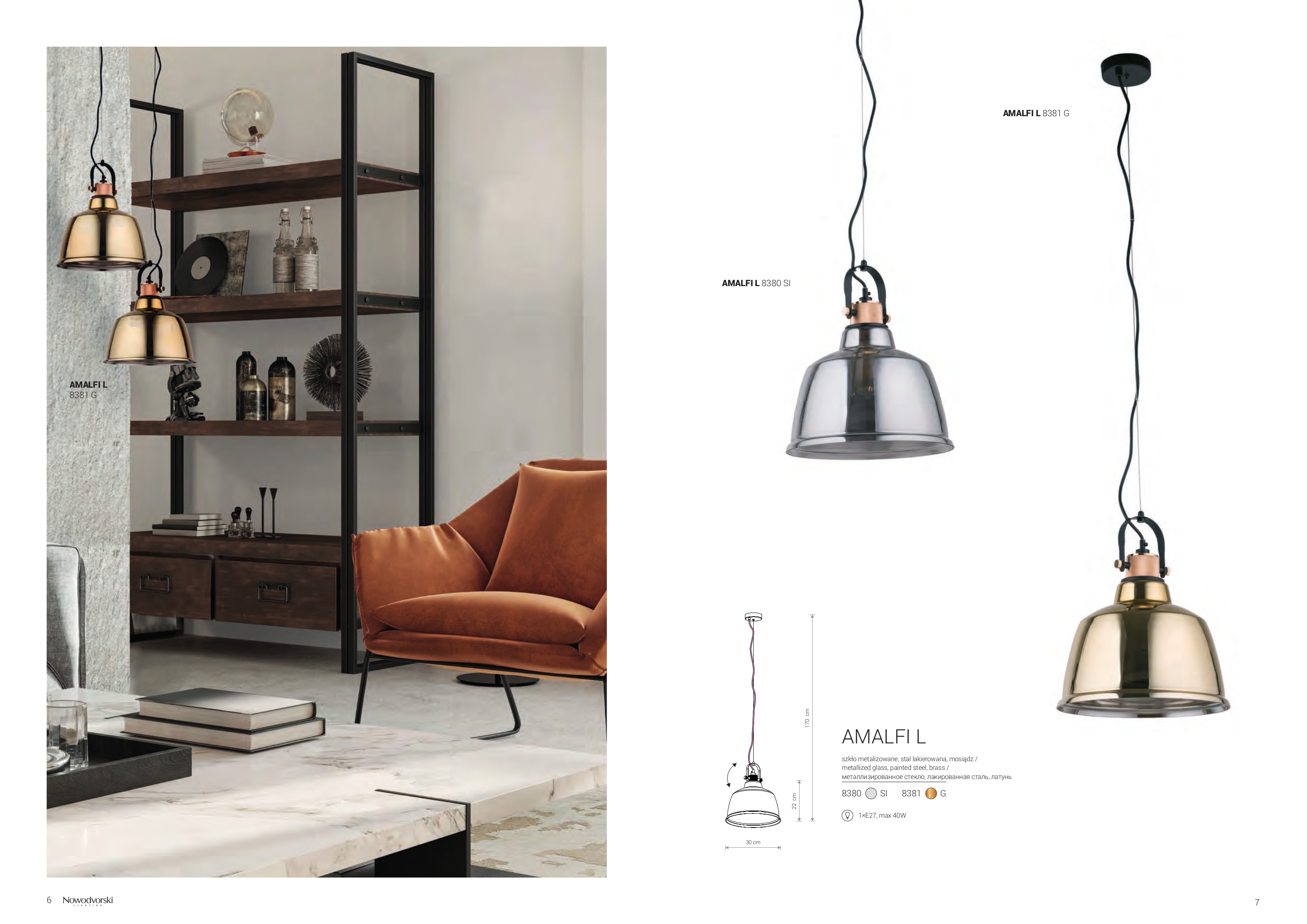 Магазини за осветителни тела ОРИОН представят осветителното тяло 8381 AMALFI GOLD I zwis L, което представлява пендел, създадено в съвременен, дизайнерски стил. Като елемент от категорията това осветително тяло е подходящо за различни помещения и пространства във Вашия дом или офис, като е изключително подходящо например за всекидневна / хол, спалня, кухня, трапезария, коридор, антре, офис.
