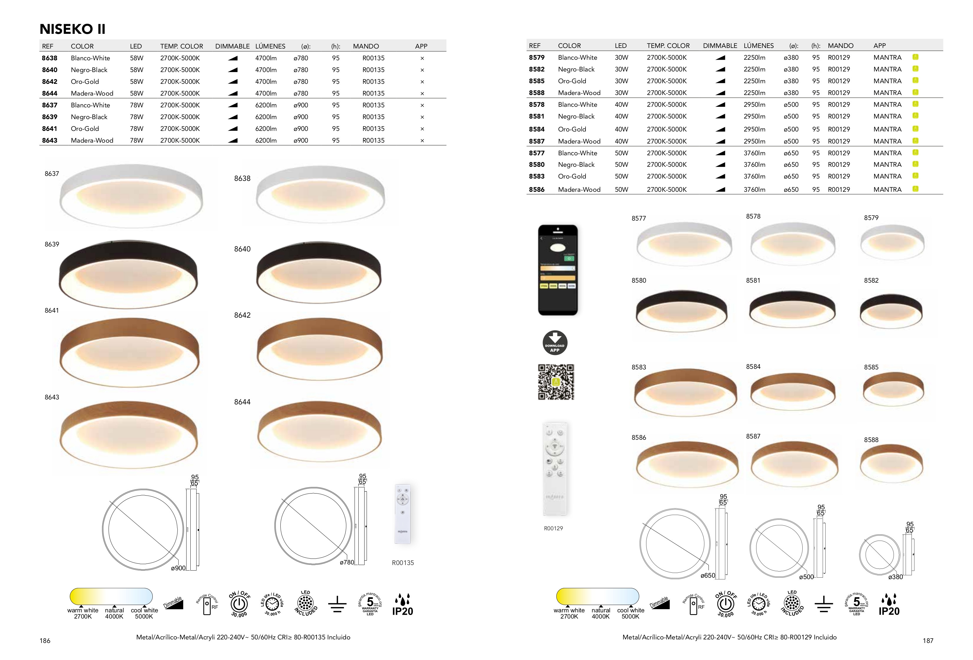 Лед плафон 8587 Wood 40W 2700K-5000K 2950lm NISEKO II PLAFON ще осигури комфорт и естетика във всяко помещение, в което се постави. Цялостната визия и дизайн на led лампата и вложените в изработката й материали, като полимер в цвят дърво, дифузер от полимер в бяло, възможност за димиране и регулиране на цветната температура с дистанционно управление и приложение за смартфон, ще допринесат за един неповторим стил. Благодарение на дългогодишния опит в производството на лед осветление, качествените материали и строгия контрол на качеството на изработка на производителя Mantra (Испания), 8587 Wood 40W 2700K-5000K 2950lm NISEKO II PLAFON е на високо европейско ниво.