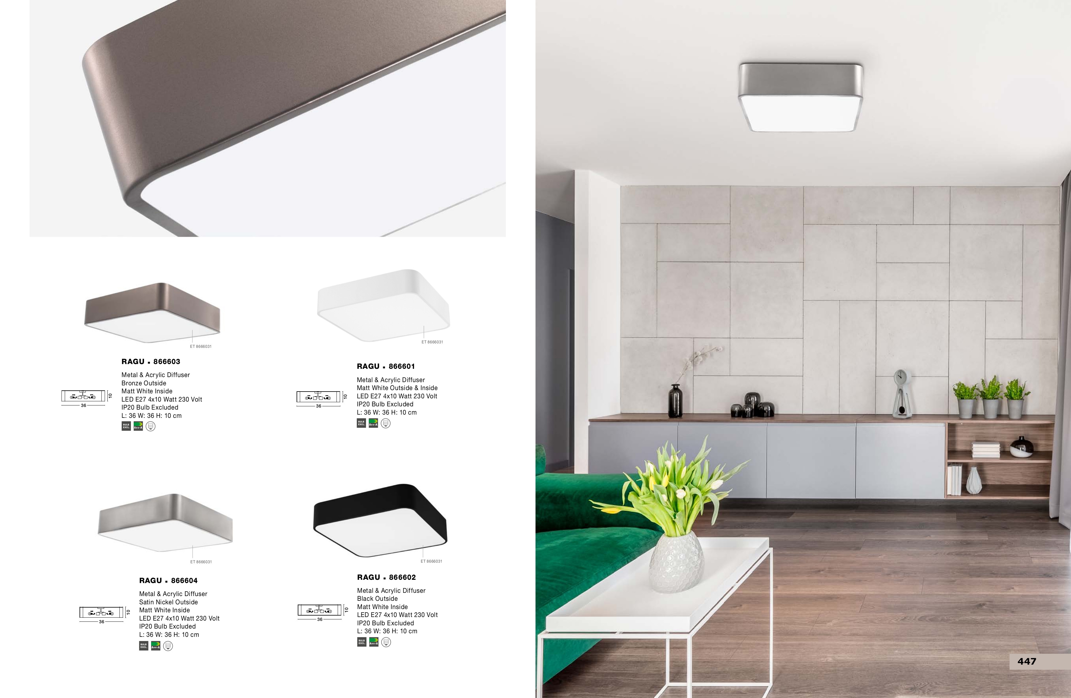Осветителното тяло 866601 ще осигури комфорт и естетика във всяко помещение, в което се постави. Цялостната визия и дизайн на лампата и вложените в изработката й материали, като метал в матово бял цвят, дифузьор от бял полимер, ще допринесат за един неповторим стил. Благодарение на дългогодишния опит, качествените материали и строгия контрол на качеството на изработка на производителя Nova-Luce (Гърция), 866601 е на високо европейско ниво.