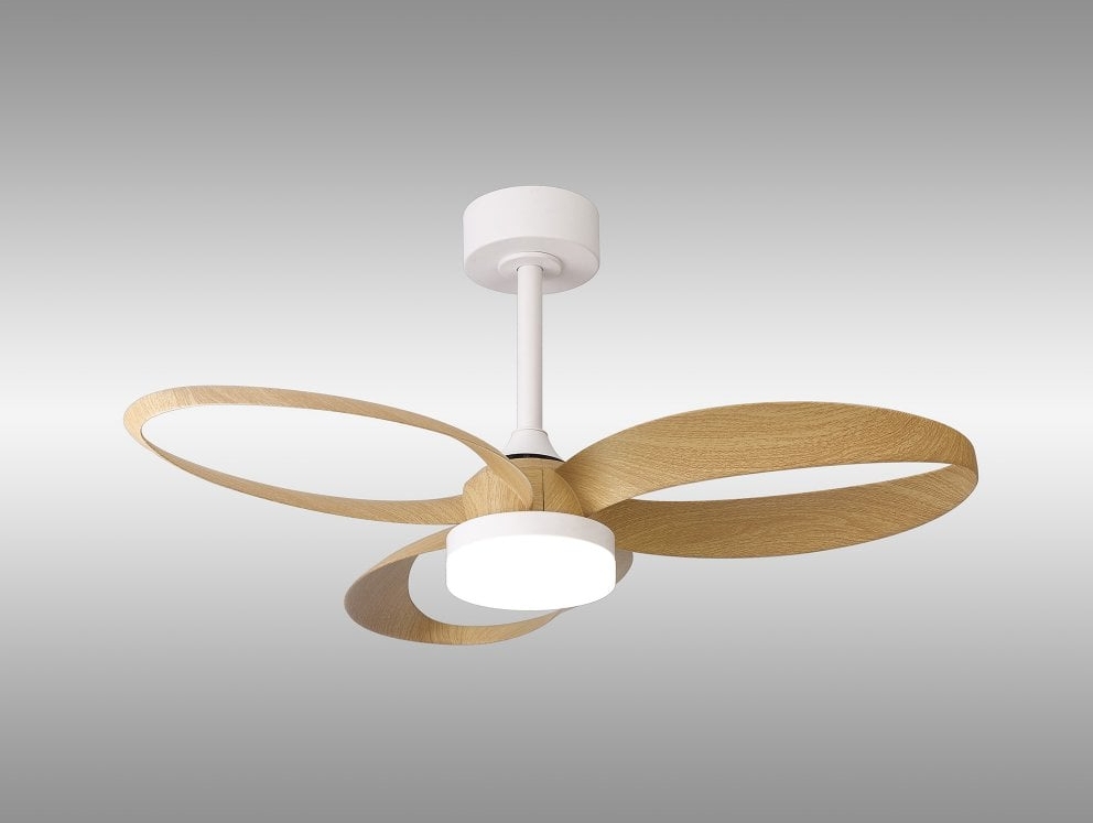 метал в бял цвят, полимер (ABS) в цвят светло дърво, дифузьор от полимер в бяло, DC мотор 32W, смяна на цветната температура (2700К/4000К/5000К), посоката и скоростта на въртене чрез дистанционно, включено в комплекта
