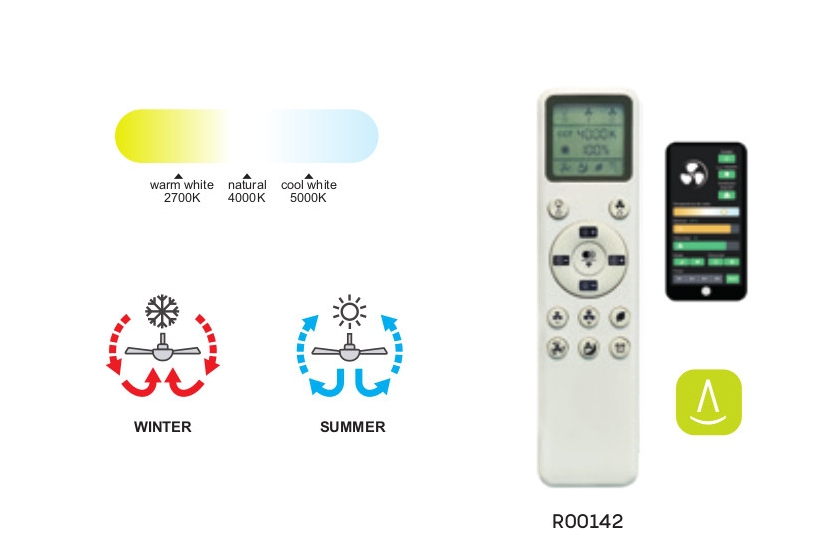 метал в бяло, дифузер от полимер в бяло, перки от полимер (ABS), дистанционно за управление на вентилатора, цветната температура и димиране, вентилатор с DC двигател 35 W