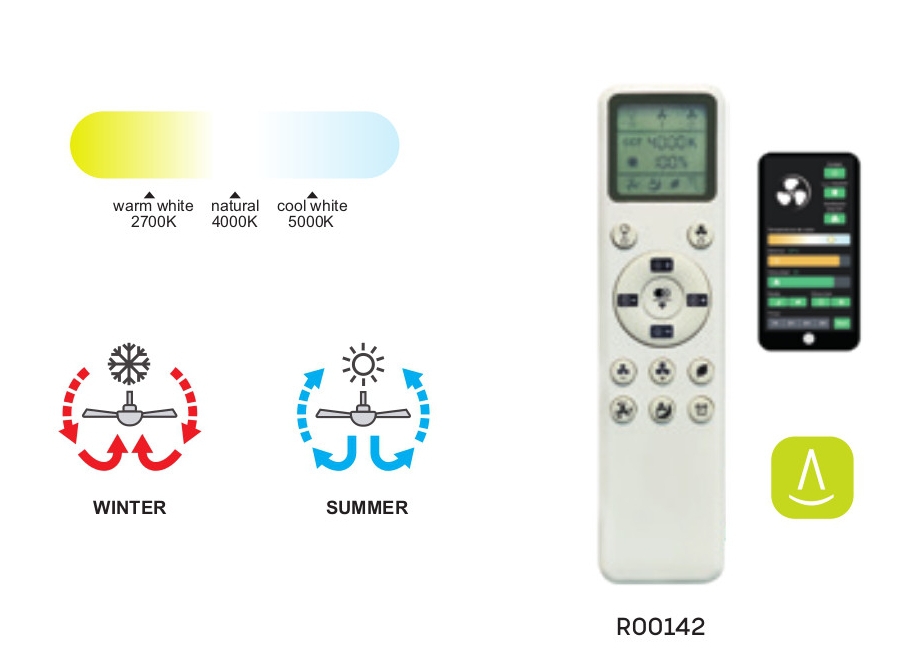 метал в черно, дифузер от полимер в бяло, перки от полимер (ABS) в черно, дистанционно за управление на вентилатора, цветната температура и димиране, вентилатор с DC двигател 35 W