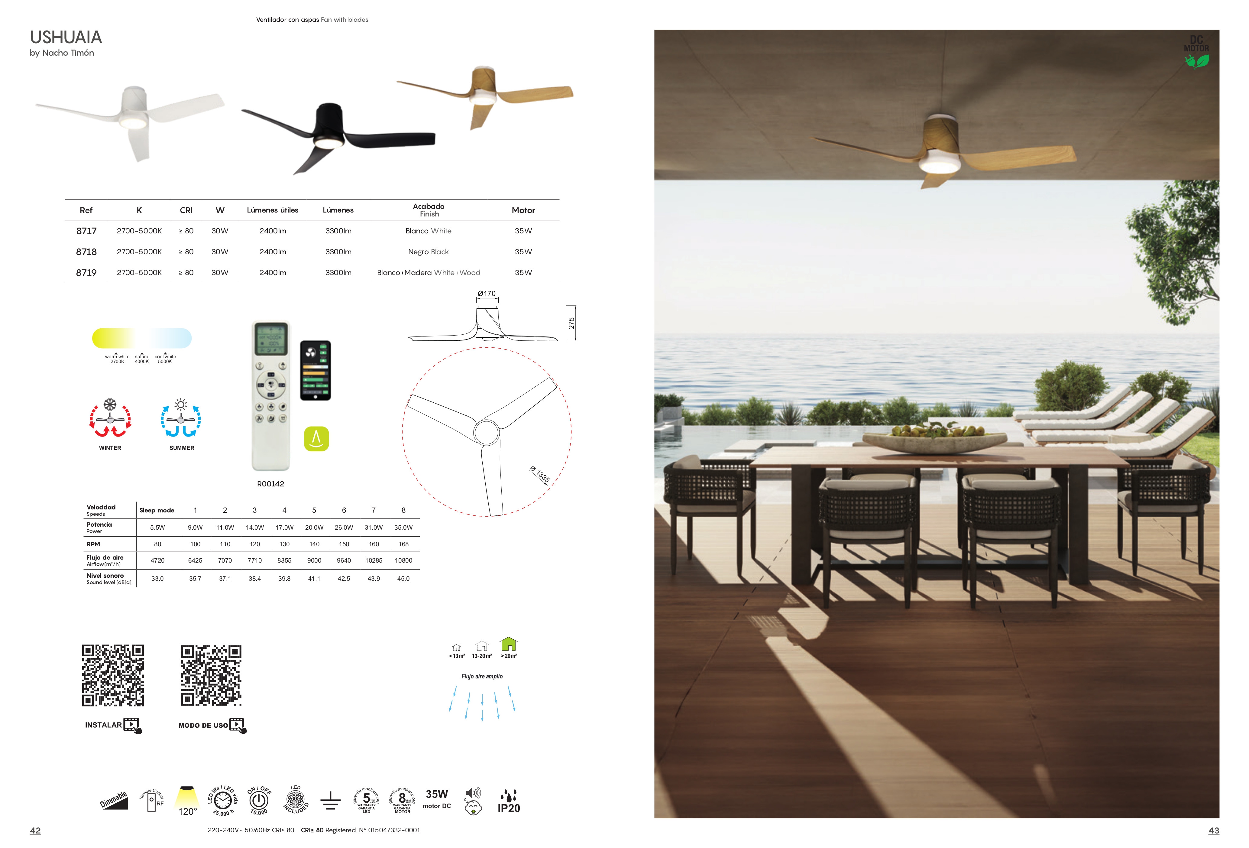 Лед плафон 8719 White+IlumitationWood 30W 2700K-5000K USHUAIA ще осигури комфорт и естетика във всяко помещение, в което се постави. Цялостната визия и дизайн на led лампата и вложените в изработката й материали, като метал в бяло, дифузер от полимер в бяло, перки от полимер (ABS) в бяло, дистанционно за управление на вентилатора, цветната температура и димиране, вентилатор с DC двигател 35 W, ще допринесат за един неповторим стил. Благодарение на дългогодишния опит в производството на лед осветление, качествените материали и строгия контрол на качеството на изработка на производителя Mantra (Испания), 8719 White+IlumitationWood 30W 2700K-5000K USHUAIA е на високо европейско ниво.