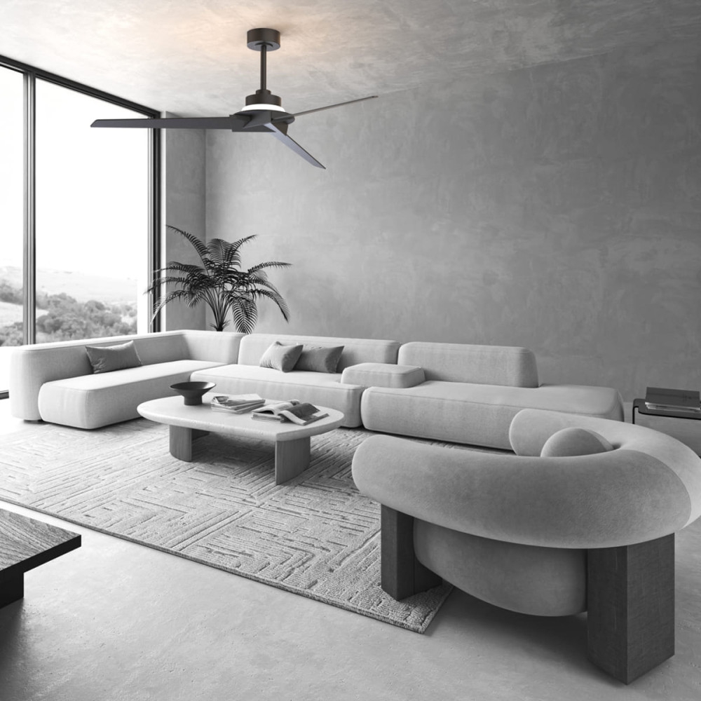 метал в черен цвят, дифузьор от силикон, перки в черно/тъмно дърво, дистанционно или приложение за смартфон за управление на вентилатора, цветната температура и димиране, вентилатор с DC двигател 40W