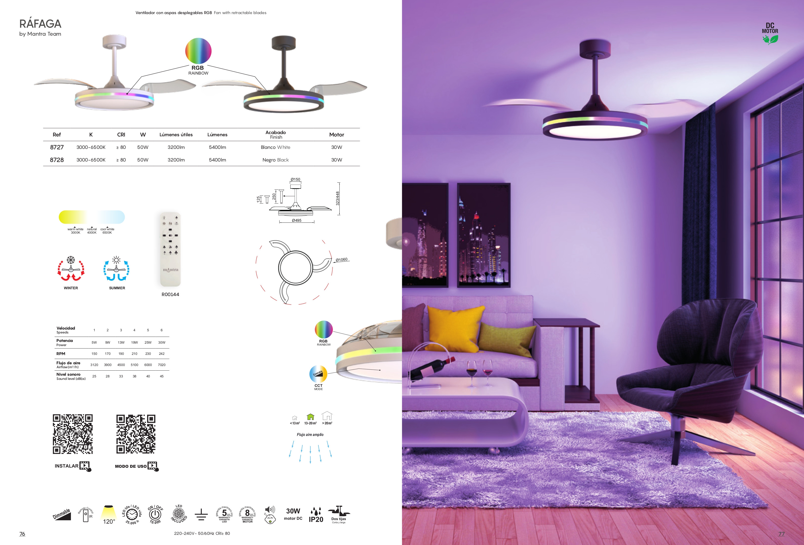 Осветителното тяло 8728 L?mpara LED 50W Fan 30W Black ще осигури комфорт и естетика във всяко помещение, в което се постави. Цялостната визия и дизайн на лампата и вложените в изработката й материали, като метал в черен цвят, перки от полимер (РММА), дифузьор от полимер в бяло, DC мотор 30W, смяна на цветната температура (3000К/4000К/6500К), RGB пръстен, посоката и скоростта на въртене чрез дистанционно, включено в комплекта, регулируема височина на тялото, ще допринесат за един неповторим стил. Благодарение на дългогодишния опит, качествените материали и строгия контрол на качеството на изработка на производителя Mantra (Испания), 8728 L?mpara LED 50W Fan 30W Black е на високо европейско ниво.