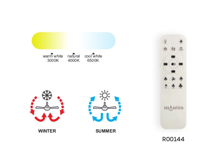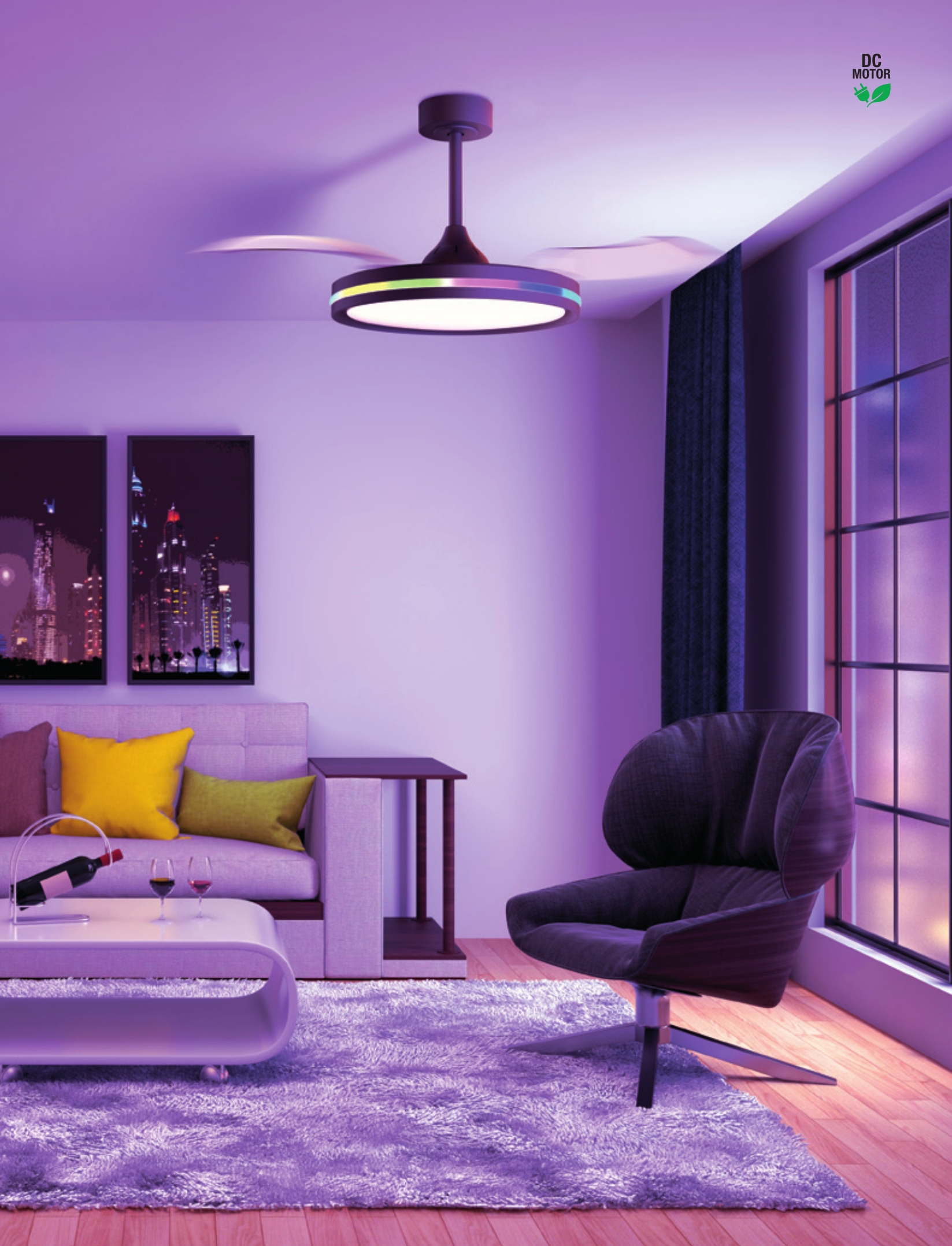 метал в черен цвят, перки от полимер (РММА), дифузьор от полимер в бяло, DC мотор 30W, смяна на цветната температура (3000К/4000К/6500К), RGB пръстен, посоката и скоростта на въртене чрез дистанционно, включено в комплекта, регулируема височина на тялото