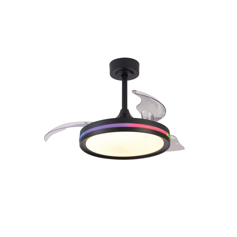 метал в черен цвят, дифузер от полимер (PMMA) в бяло, прозрачни перки от поликарбонат, дистанционно за управление на режимите на вентилатора и смяна на цветната температура на плафона и RGB цвета на тороида, DC двигател 28 W