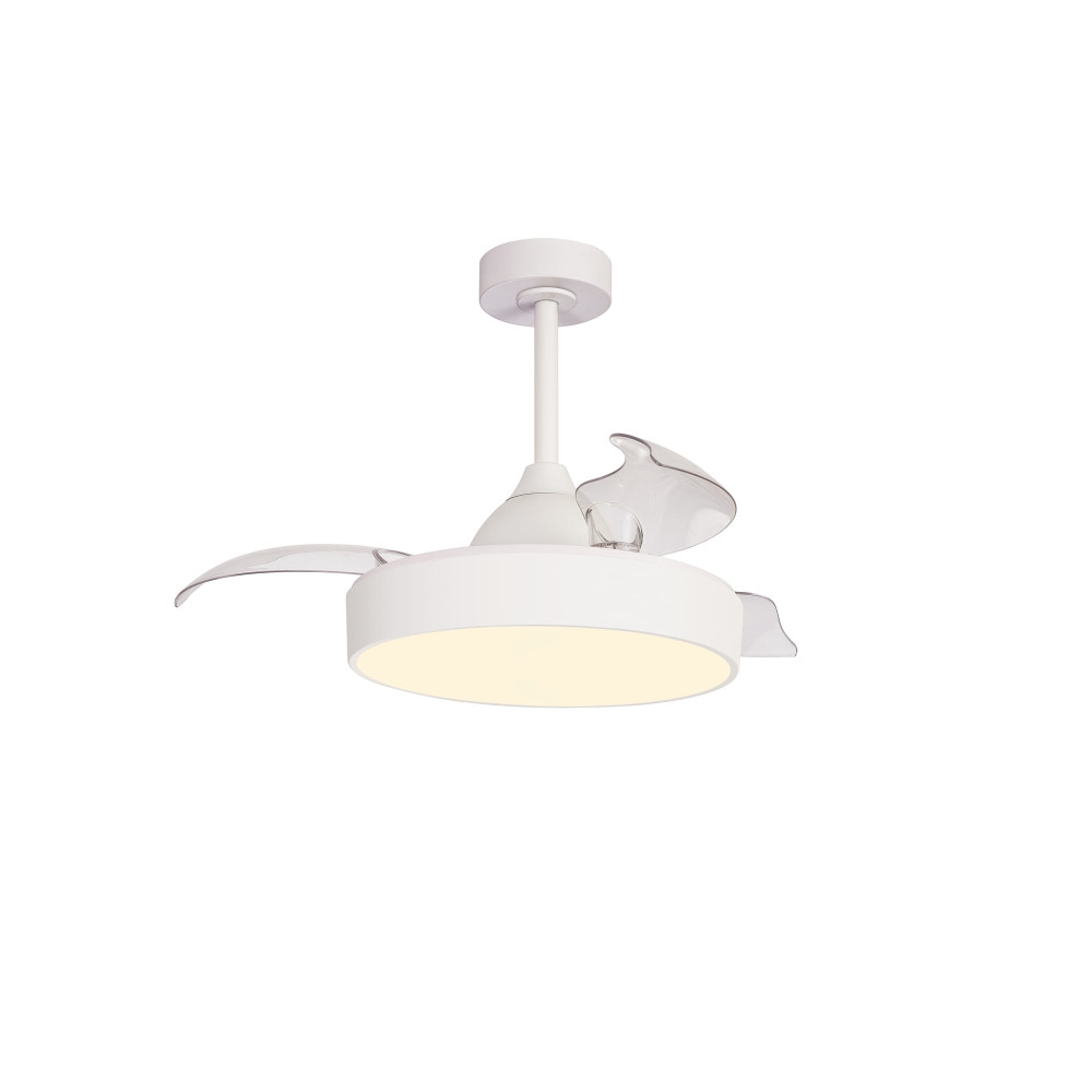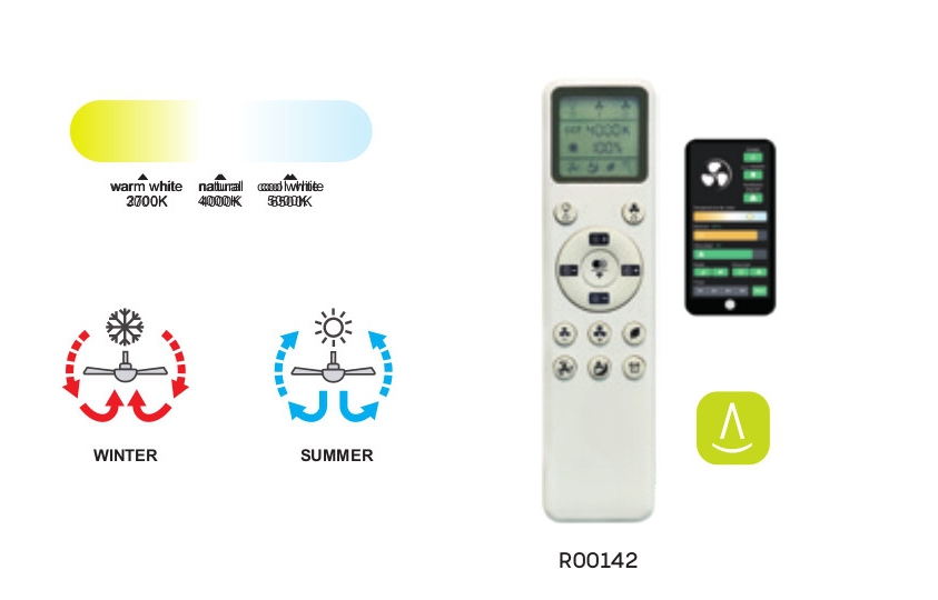 метал в бяло, дифузер от полимер (ABS и PMMA), перки от прозрачен поликарбонат, дистанционно и приложение за смартфон за управление на режимите на вентилатора и смяна на цветната температура на плафона, DC двигател 25 W