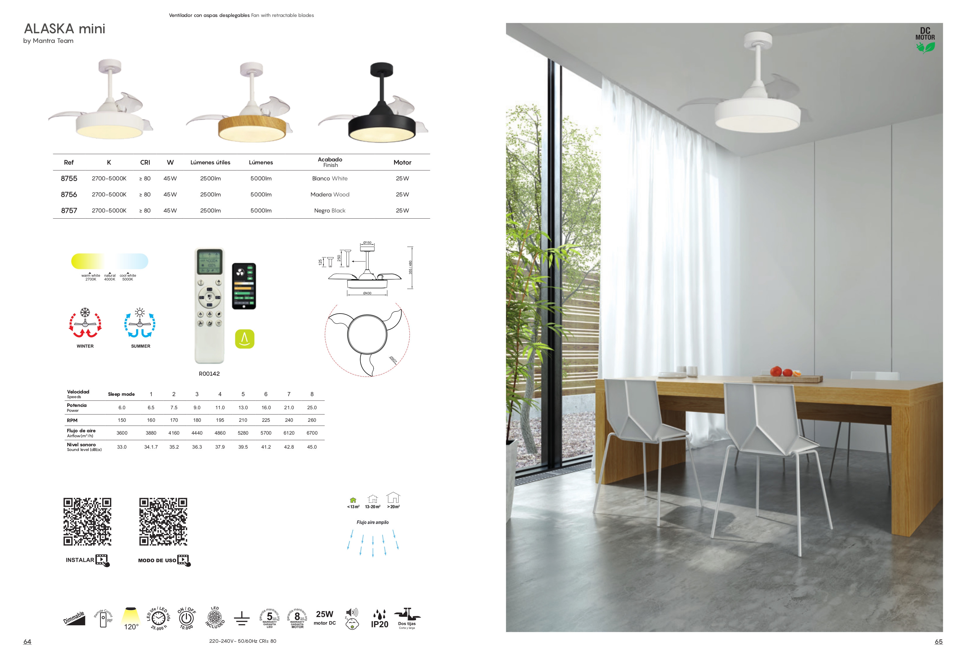 Лед плафон 8756 LED Ceil45W Fan 25W Wood ще осигури комфорт и естетика във всяко помещение, в което се постави. Цялостната визия и дизайн на led лампата и вложените в изработката й материали, като метал в бяло, дифузер от полимер (ABS и PMMA), декоративен простен от полимер в цвят дърво, перки от прозрачен поликарбонат, дистанционно и приложение за смартфон за управление на режимите на вентилатора и смяна на цветната температура на плафона, DC двиг, ще допринесат за един неповторим стил. Благодарение на дългогодишния опит в производството на лед осветление, качествените материали и строгия контрол на качеството на изработка на производителя Mantra (Испания), 8756 LED Ceil45W Fan 25W Wood е на високо европейско ниво.