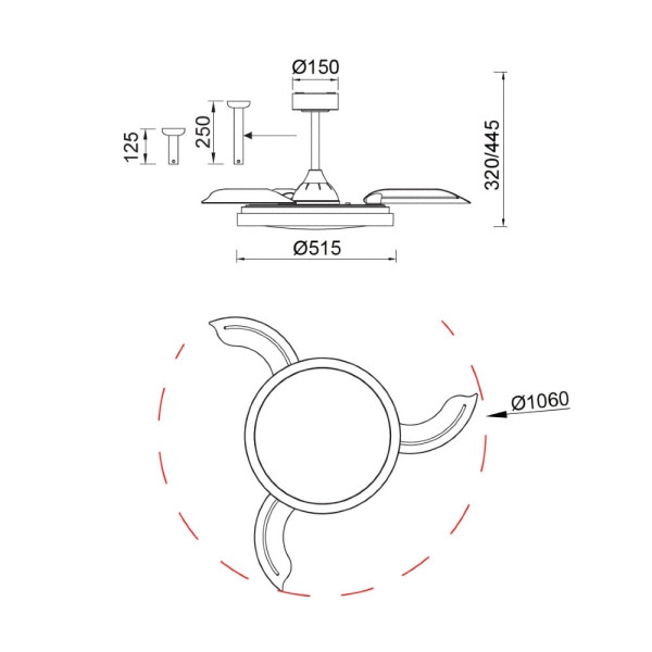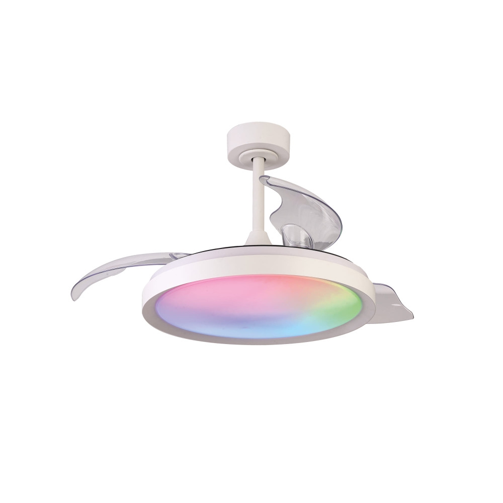 метал в бяло, дифузер от полимер (ABS и PMMA), прибиращи се перки от прозрачен поликарбонат, дистанционно за управление на RGB и режимите на вентилатора и смяна на цветната температура на плафона, DC двигател 30 W