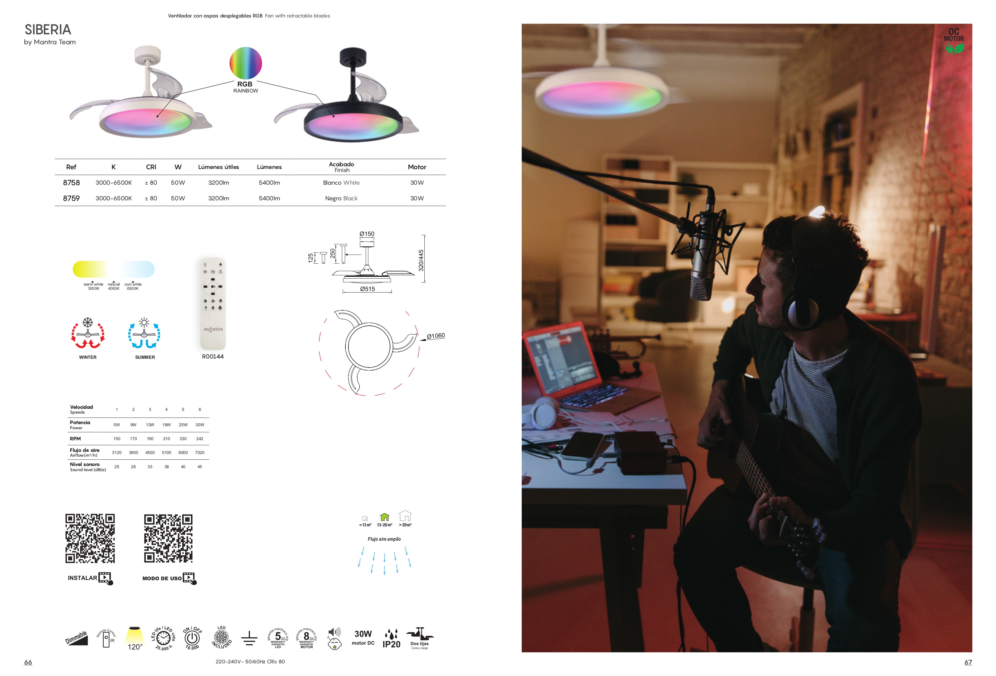 Осветителното тяло 8758 LED Ceil50W Fan 30W White ще осигури комфорт и естетика във всяко помещение, в което се постави. Цялостната визия и дизайн на лампата и вложените в изработката й материали, като метал в бяло, дифузер от полимер (ABS и PMMA), прибиращи се перки от прозрачен поликарбонат, дистанционно за управление на RGB и режимите на вентилатора и смяна на цветната температура на плафона, DC двигател 30 W, ще допринесат за един неповторим стил. Благодарение на дългогодишния опит, качествените материали и строгия контрол на качеството на изработка на производителя Mantra (Испания), 8758 LED Ceil50W Fan 30W White е на високо европейско ниво.