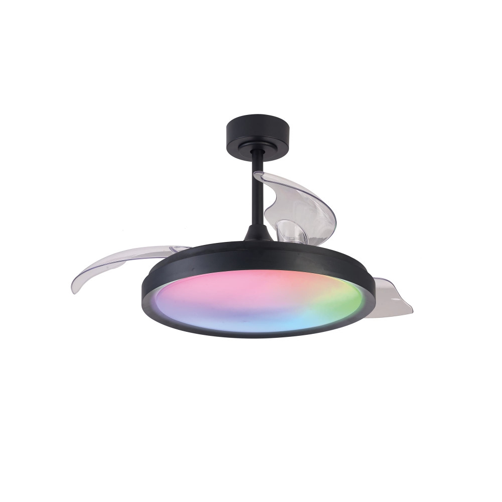 метал в черно, дифузер от полимер (ABS и PMMA), прибиращи се перки от прозрачен поликарбонат, дистанционно за управление на RGB и режимите на вентилатора и смяна на цветната температура на плафона, DC двигател 30 W