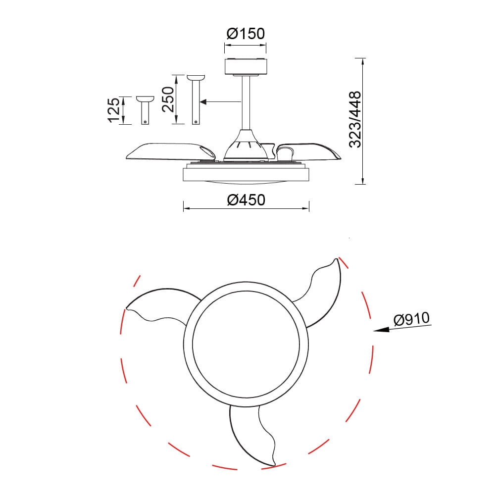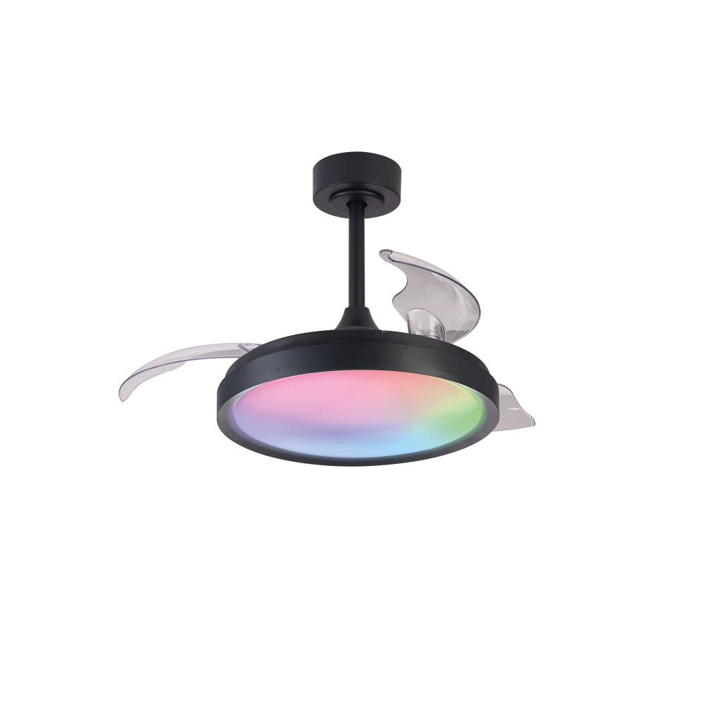 метал в черно, дифузер от полимер (ABS и PMMA), прибиращи се перки от прозрачен поликарбонат, дистанционно за управление на RGB и режимите на вентилатора и смяна на цветната температура на плафона, DC двигател 28 W