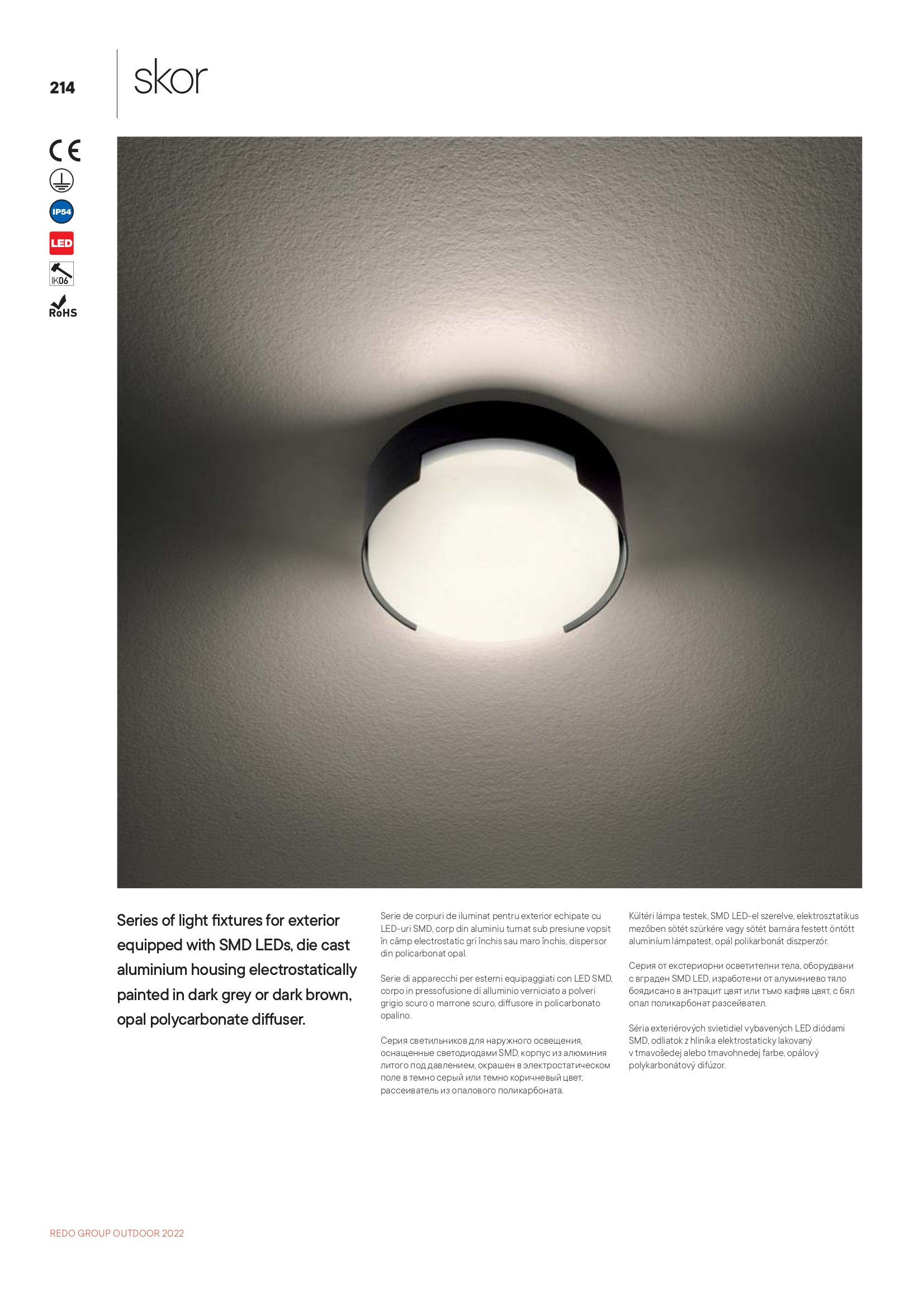 Осветителното тяло 90005 ще осигури комфорт и естетика във всяко помещение, в което се постави. Цялостната визия и дизайн на лампата и вложените в изработката й материали, като алуминиево тяло в цвят антрацит, опалово бял поликарбонатен дифузер, ще допринесат за един неповторим стил. Благодарение на дългогодишния опит, качествените материали и строгия контрол на качеството на изработка на дизайнерската линия Redo Outdoor на производителя Redo (Румъния), 90005 е на високо европейско ниво.