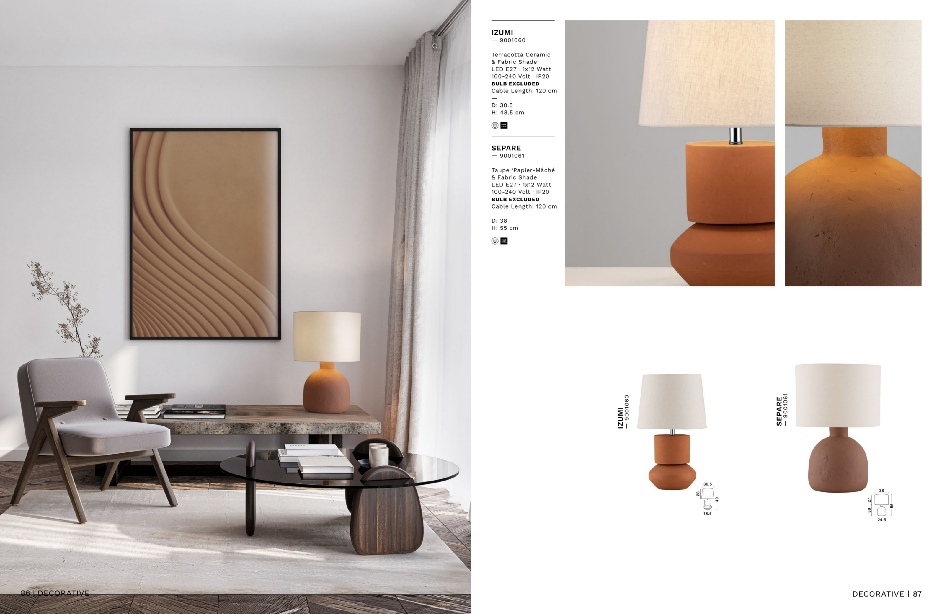 Осветителното тяло 9001061 ще осигури комфорт и естетика във всяко помещение, в което се постави. Цялостната визия и дизайн на лампата и вложените в изработката й материали, като основа от Papier-Mâché в кафяво, абажур от текстил в цвят слонова кост, дължина на кабела 1.2m, ще допринесат за един неповторим стил. Благодарение на дългогодишния опит, качествените материали и строгия контрол на качеството на изработка на производителя Nova-Luce (Гърция), 9001061 е на високо европейско ниво.