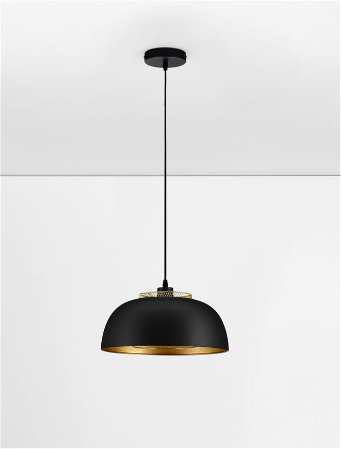 Стилът и естетиката на обстановката ще се обогатят благодарение, както на цялостната визия и дизайн на осветителното тяло, така и на вложените в изработката му, качествени материали, като: метал в пясъчно черно и златно, захранващ кабел с ключ ON/OFF и щепсел в черен цвят.