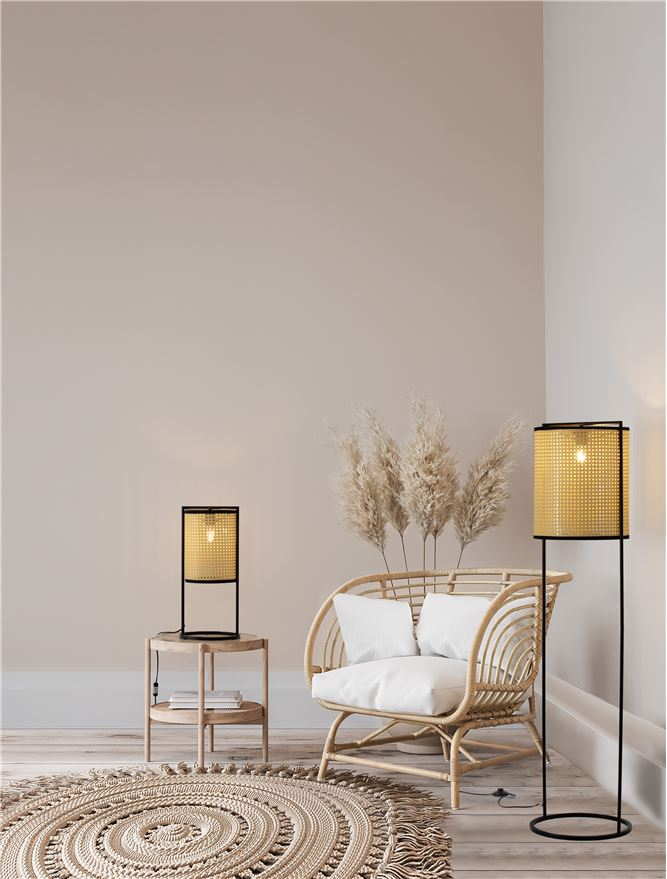 ратан в естествен цвят, метал в матово черно, захранващ кабел 150sm с щепсел и превключвател ON/OFF