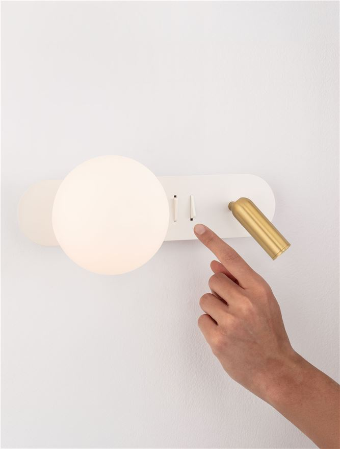 метал в матово бял цвят, насочващо се тяло с покритие от месинг и тяло с бяло сферично стъкло, два превключвателя