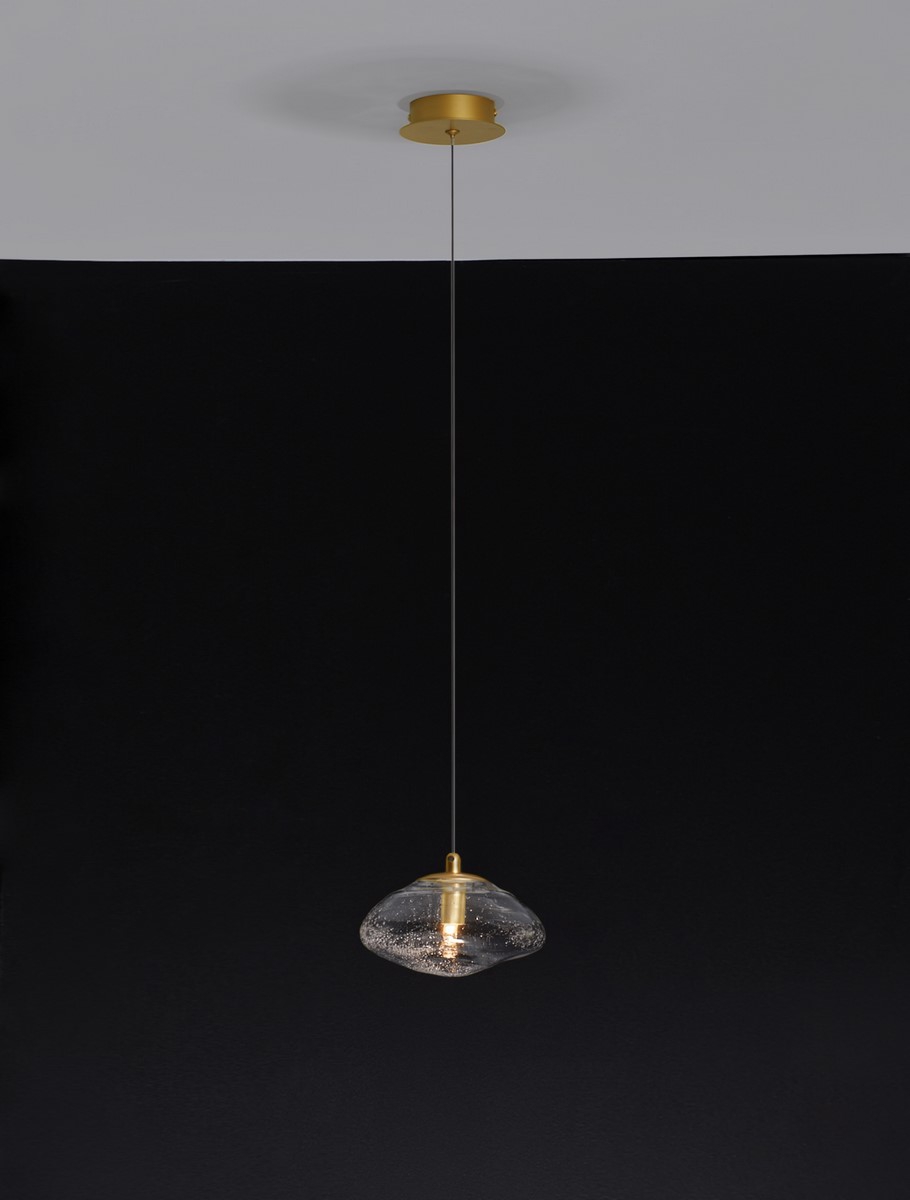 Стилът и естетиката на обстановката ще се обогатят благодарение, както на цялостната визия и дизайн на осветителното тяло, така и на вложените в изработката му, качествени материали, като: метал в цвят златен месинг, издухано прозрачно стъкло.