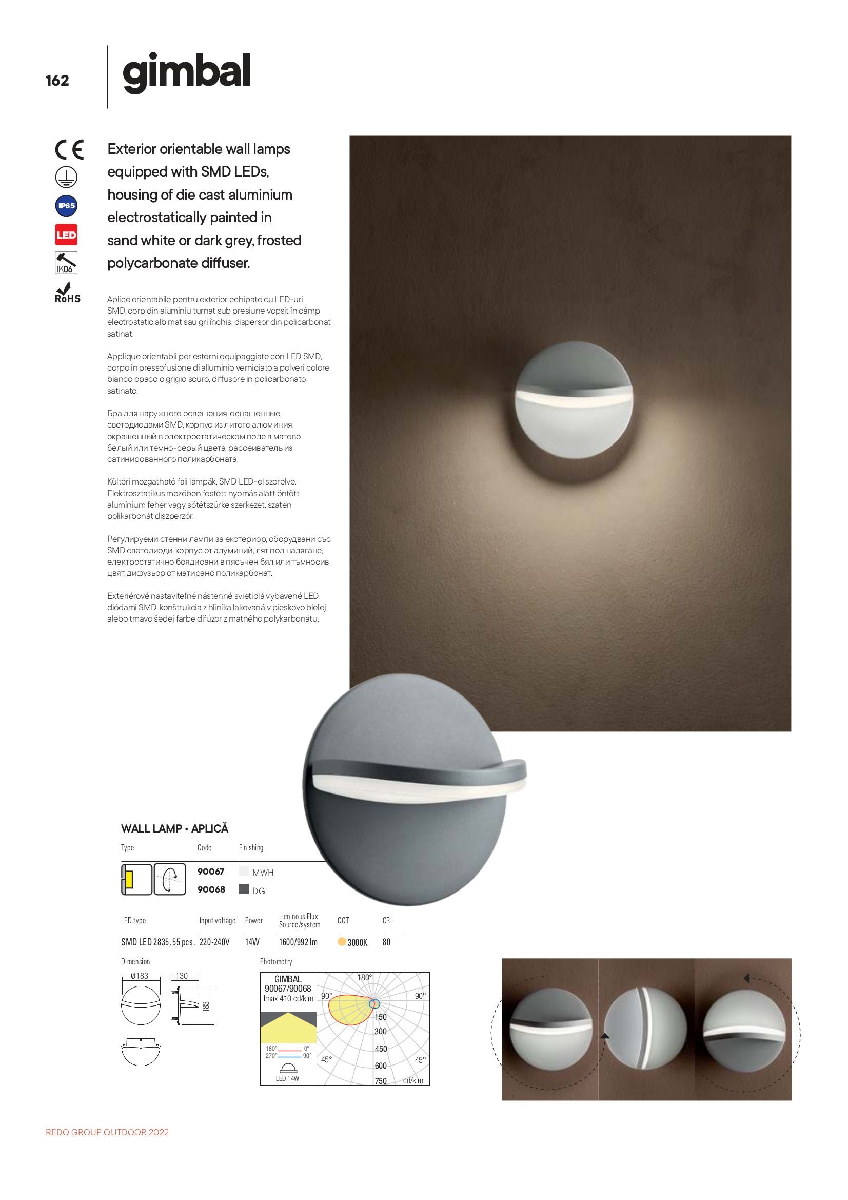 Лед аплик, външна лампа 90067 ще осигури комфорт и естетика във всяко помещение, в което се постави. Цялостната визия и дизайн на led лампата и вложените в изработката й материали, като алуминий лят под налягане в матово бяло, дифузер от матирано бял полимер, тялото има опция за завъртане около остта, ще допринесат за един неповторим стил. Благодарение на дългогодишния опит в производството на лед осветление, качествените материали и строгия контрол на качеството на изработка на дизайнерската линия Redo Outdoor на производителя Redo (Румъния), 90067 е на високо европейско ниво.
