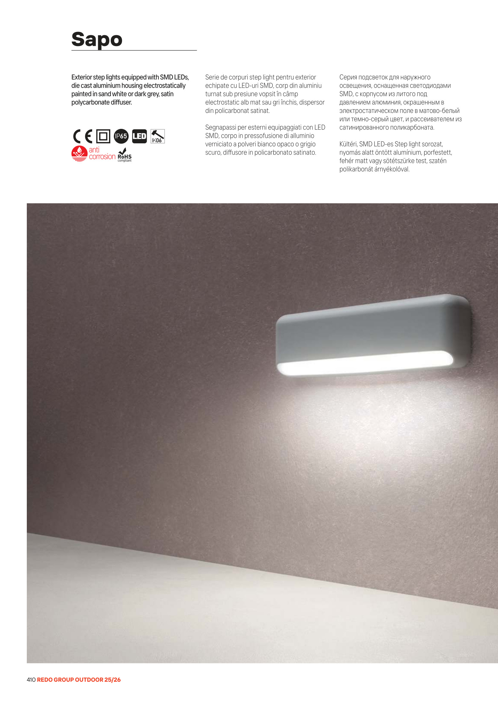 Лед аплик, външна лампа 90070 ще осигури комфорт и естетика във всяко помещение, в което се постави. Цялостната визия и дизайн на led лампата и вложените в изработката й материали, като алуминий отлят под налягане в тъмно сив цвят, дифузер от сатениран поликарбонат, ще допринесат за един неповторим стил. Благодарение на дългогодишния опит в производството на лед осветление, качествените материали и строгия контрол на качеството на изработка на дизайнерската линия Redo Outdoor на производителя Redo (Румъния), 90070 е на високо европейско ниво.