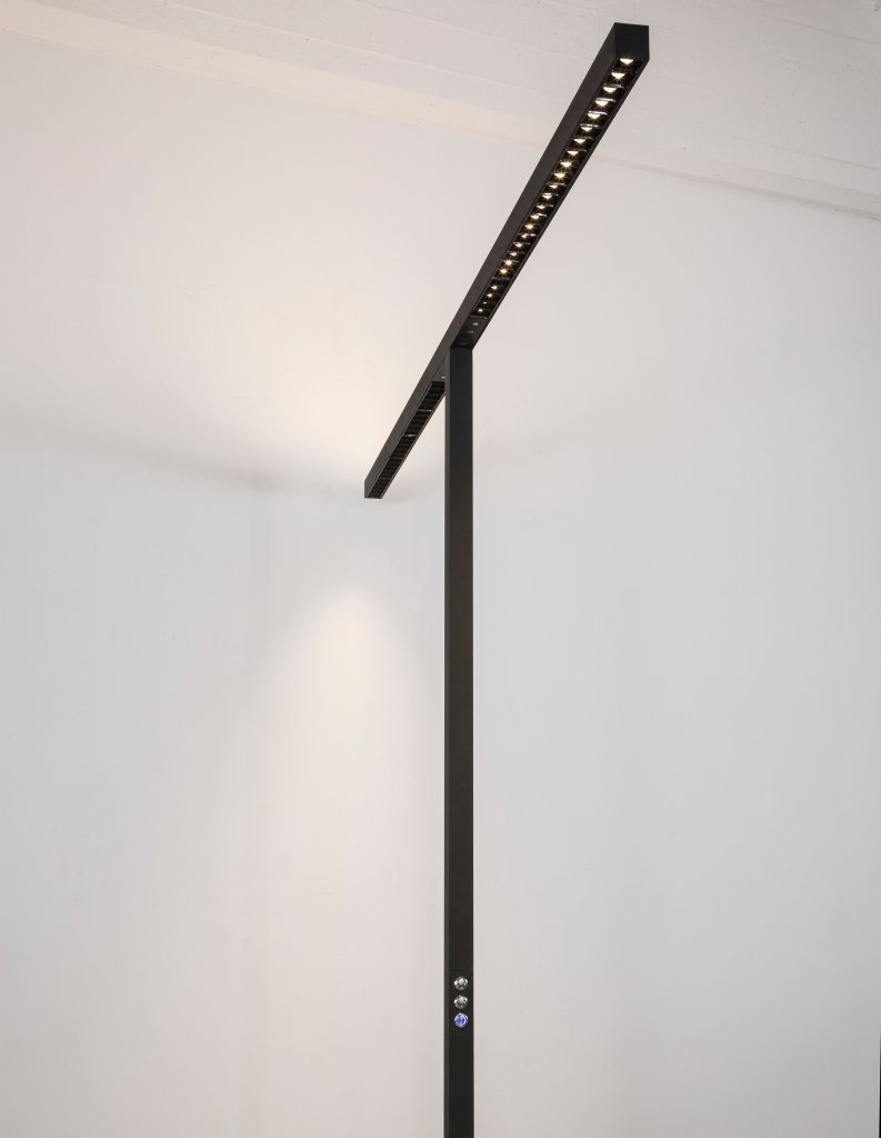алуминий в матово черен цвят, осветление нагоре - 45 W, димируемо осветление надолу 15 W, захранващ кабел и щепсел, ключът и димерът са вградени в лампата