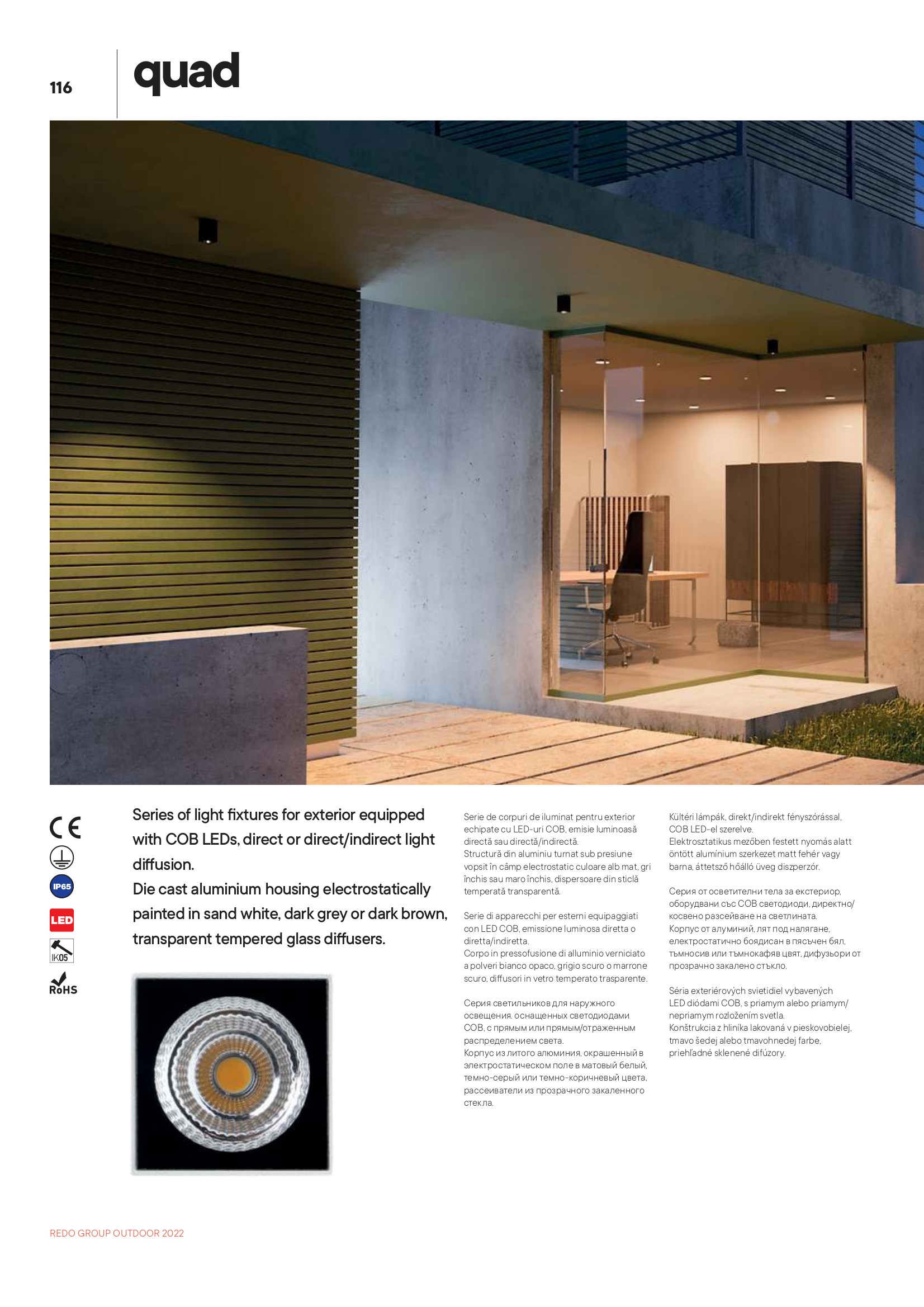 Лед аплик, външна лампа 90089 ще осигури комфорт и естетика във всяко помещение, в което се постави. Цялостната визия и дизайн на led лампата и вложените в изработката й материали, като алуминий лят под налягане с електростатично нанесено покритие в тъмно кафяв цвят, дифузьор от закалено стъкло, ще допринесат за един неповторим стил. Благодарение на дългогодишния опит в производството на лед осветление, качествените материали и строгия контрол на качеството на изработка на дизайнерската линия Redo Outdoor на производителя Redo (Румъния), 90089 е на високо европейско ниво.