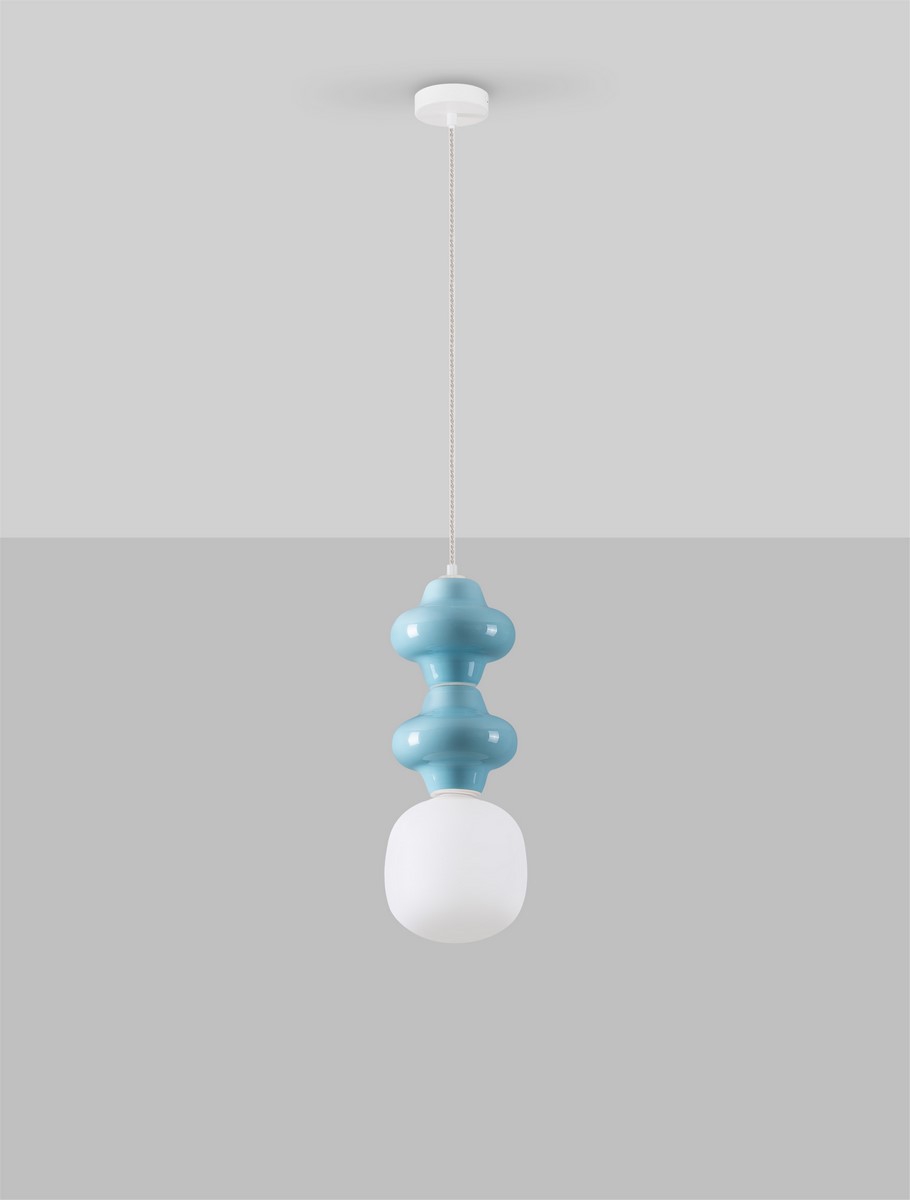 Стилът и естетиката на обстановката ще се обогатят благодарение, както на цялостната визия и дизайн на осветителното тяло, така и на вложените в изработката му, качествени материали, като: метал в матово бял цвят, керамика в бледо синьо, обработено с киселина, опалово бяло стъкло.