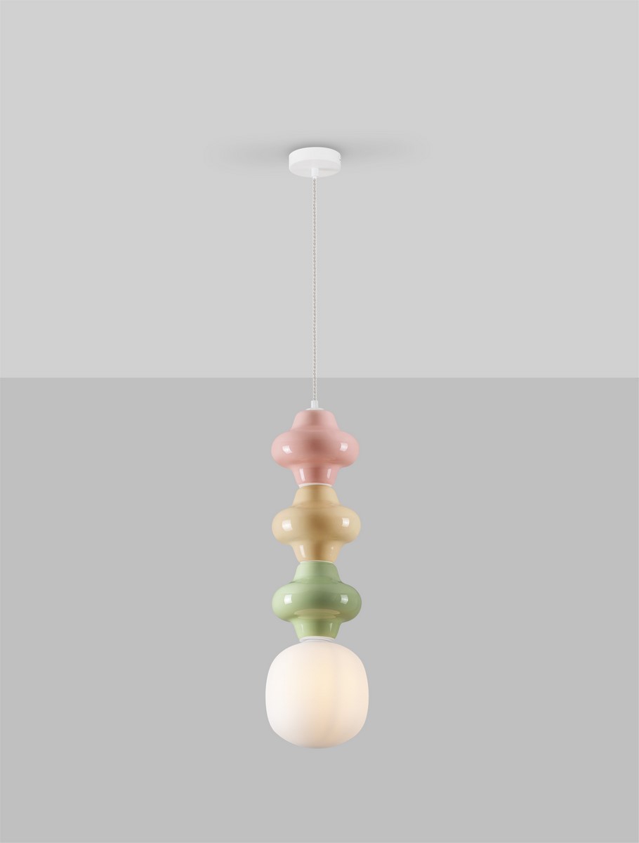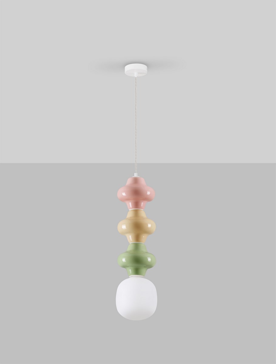 метал в цвят бял мат, керамика в бледо розово, жълто и зелено, обработено с киселина, опалово бяло стъкло