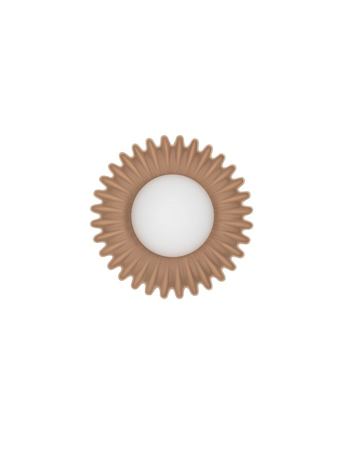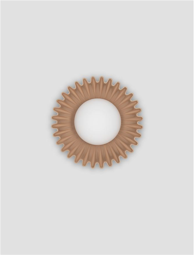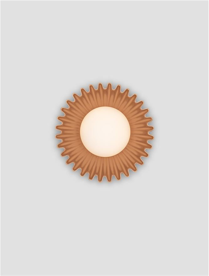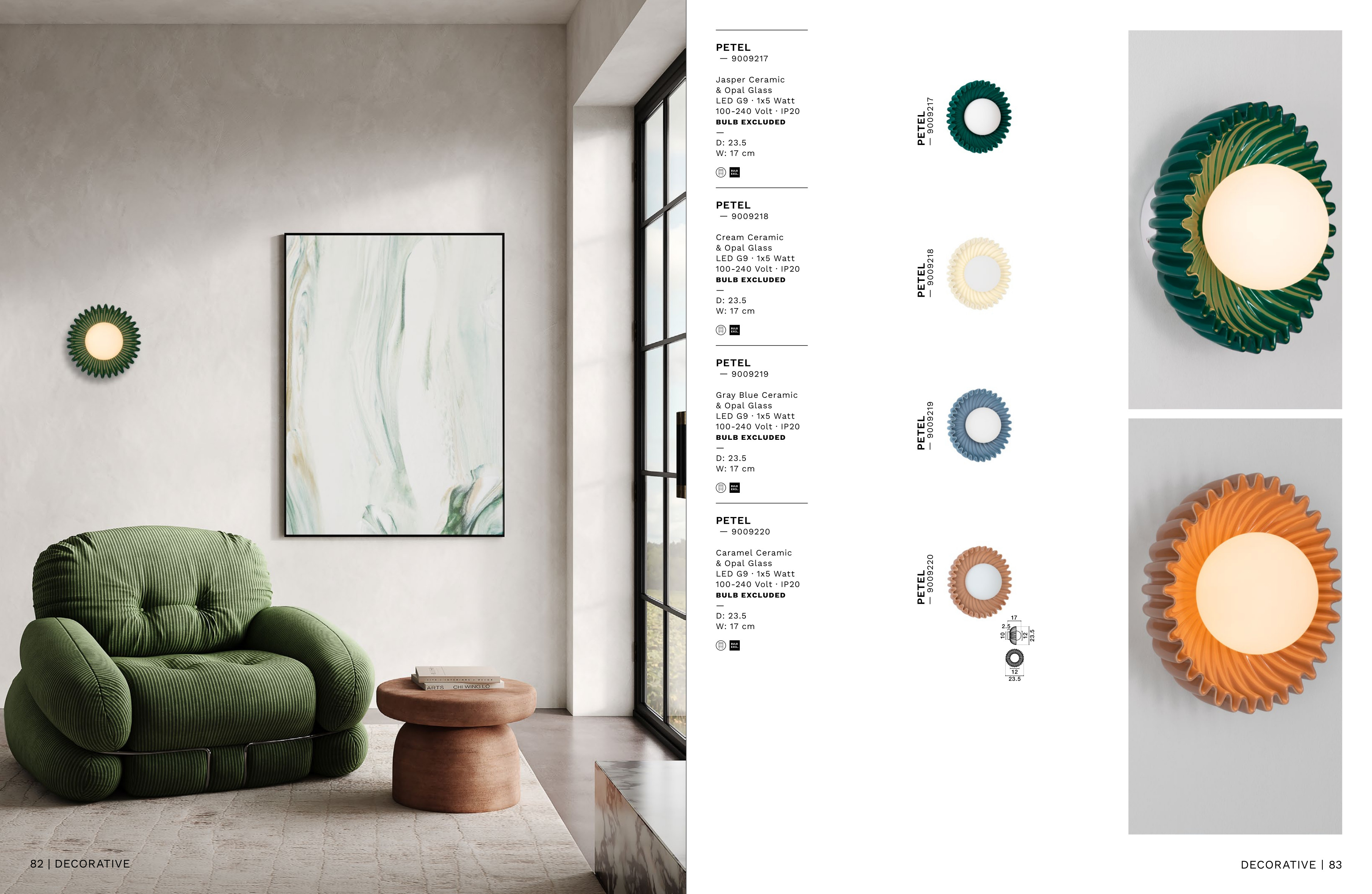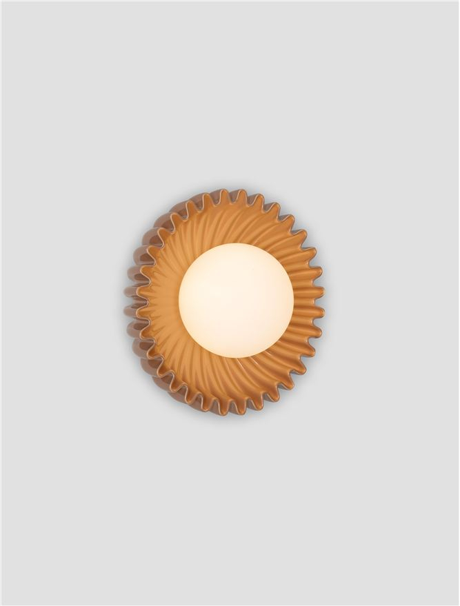 За стила и естетиката на обстановката допринасят, както цялостната визия и дизайн на осветителното тяло, така и вложените в изработката качествени материали, като: керамика в цвят карамел, стъкло в цвят опал.