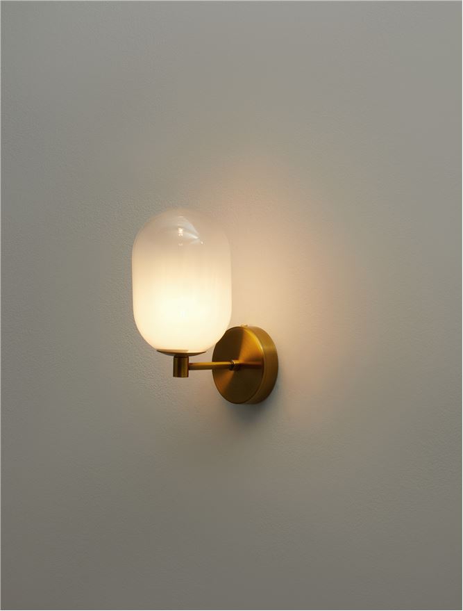 За стила и естетиката на обстановката допринасят, както цялостната визия и дизайн на осветителното тяло, така и вложените в изработката качествени материали, като: метал в цвят златен месинг, градиентно бяло стъкло.
