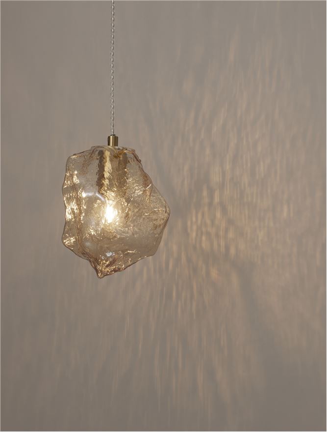 Стилът и естетиката на обстановката ще се обогатят благодарение, както на цялостната визия и дизайн на осветителното тяло, така и на вложените в изработката му, качествени материали, като: метал в цвят златен месинг, стъкло в цвят кехлибар.