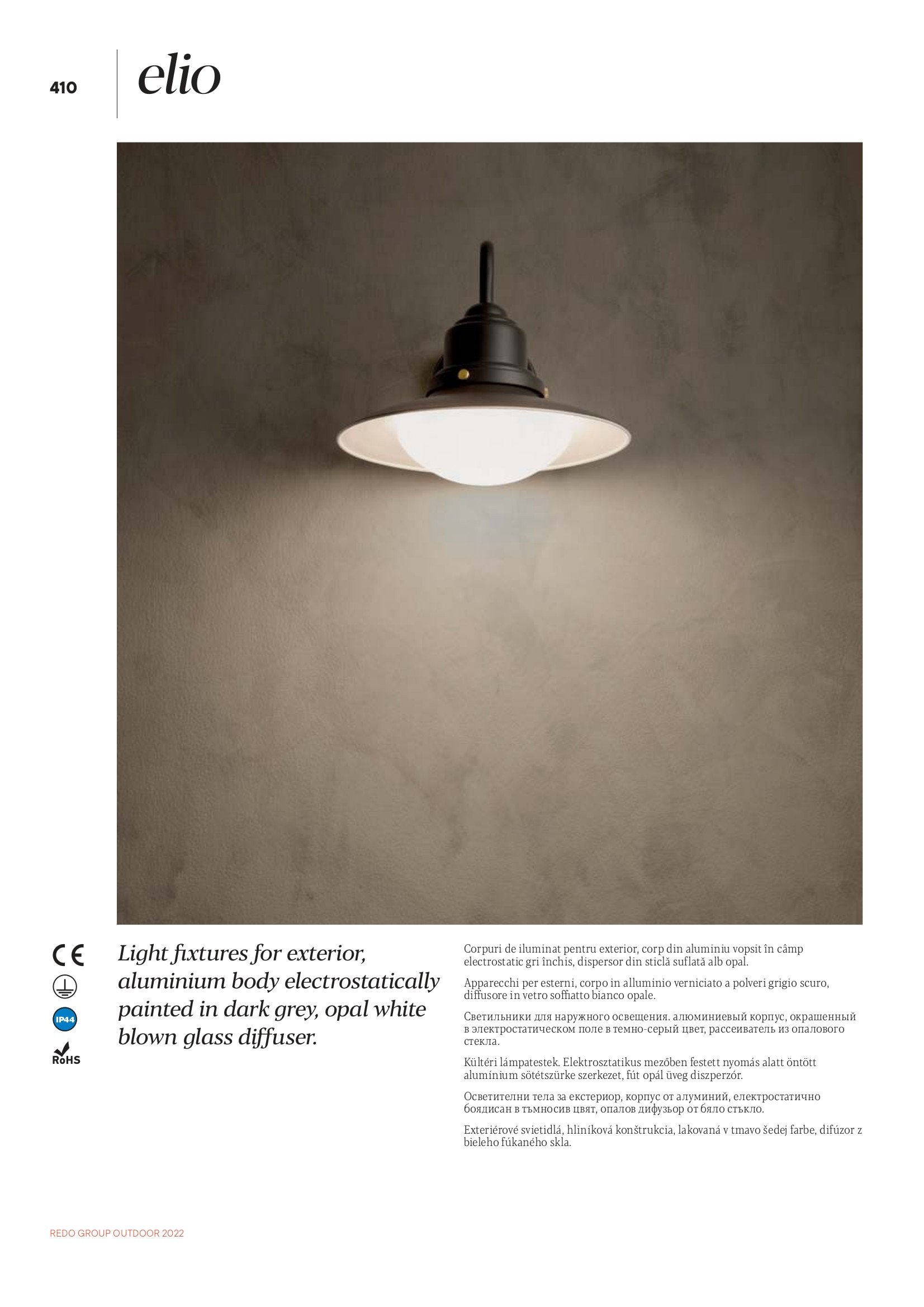 Осветителното тяло 90094 ще осигури комфорт и естетика във всяко помещение, в което се постави. Цялостната визия и дизайн на лампата и вложените в изработката й материали, като алуминий с електростатично нанесено покритие в тъмно сив цвят, дифузьор от опалово бяло стъкло, ще допринесат за един неповторим стил. Благодарение на дългогодишния опит, качествените материали и строгия контрол на качеството на изработка на дизайнерската линия Redo Outdoor на производителя Redo (Румъния), 90094 е на високо европейско ниво.
