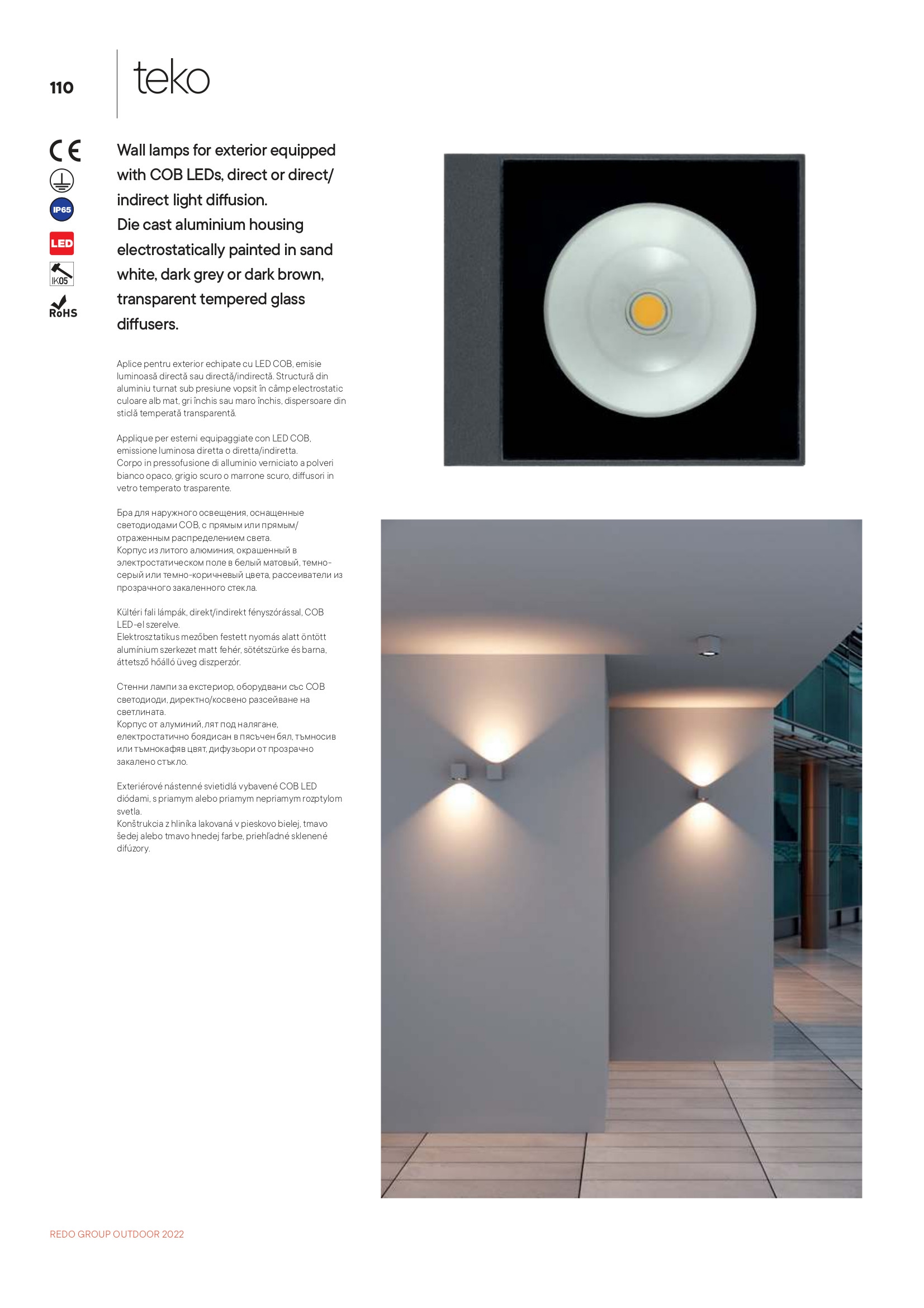 Осветителното тяло 90097 ще осигури комфорт и естетика във всяко помещение, в което се постави. Цялостната визия и дизайн на лампата и вложените в изработката й материали, като алуминий лят под налягане с електростатично нанесено покритие в пясъчно бяло, дифузьор от прозрачно закалено стъкло , ще допринесат за един неповторим стил. Благодарение на дългогодишния опит, качествените материали и строгия контрол на качеството на изработка на дизайнерската линия Redo Outdoor на производителя Redo (Румъния), 90097 е на високо европейско ниво.
